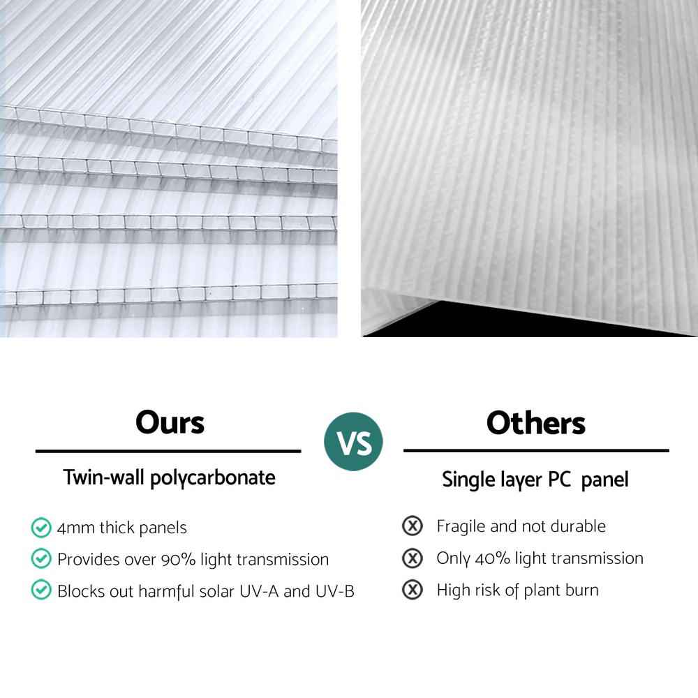 The UV-resistant twin-wall polycarbonate panels diffuse light evenly, helping plants thrive without harsh exposure. Adjustable roof vents support healthy airflow, keeping temperature and humidity levels stable even on warmer days.