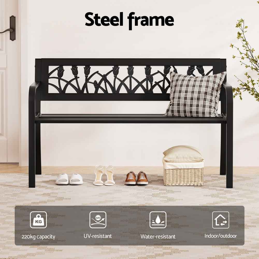 Whether you’re creating a welcoming garden corner, upgrading your front porch, or adding a functional piece to your hallway, this outdoor bench combines style and reliability to suit any home. Its classic black finish and tulip motif effortlessly complement both modern and traditional décor.