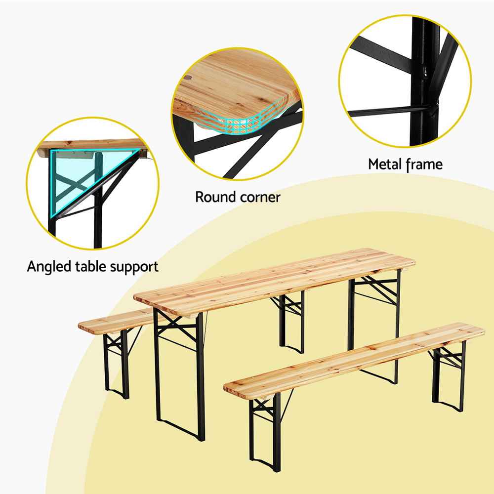 Crafted with practicality and performance in mind, this outdoor dining set seats up to six people comfortably. The smooth, natural wood grain finish adds rustic charm, while the sturdy metal legs provide stability on any surface. Perfect for outdoor gatherings, camping trips, picnics, parties, or even use in cafes and restaurants, it’s designed to suit any occasion.