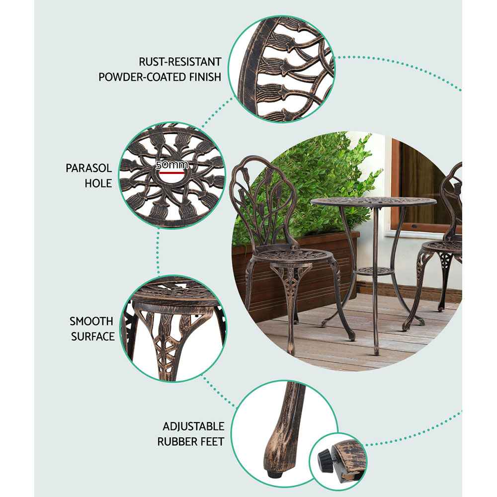 With its classic vintage-inspired look, this bistro set blends effortlessly into any garden décor. The powder-coated cast aluminium frame and cast iron legs ensure strength and stability, while the rubber foot pads protect your flooring and prevent slipping. The integrated parasol hole provides the option to add shade for those sunny afternoons.