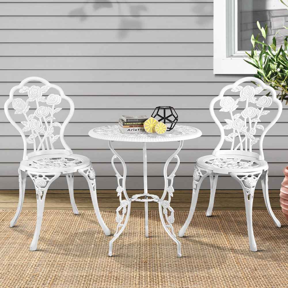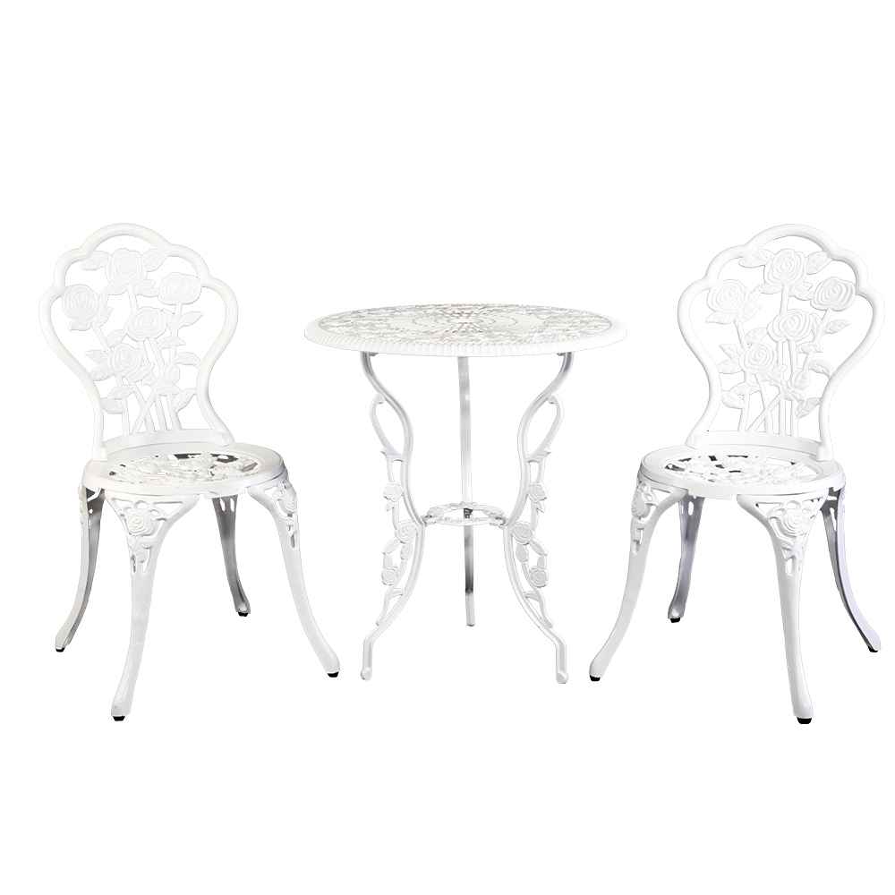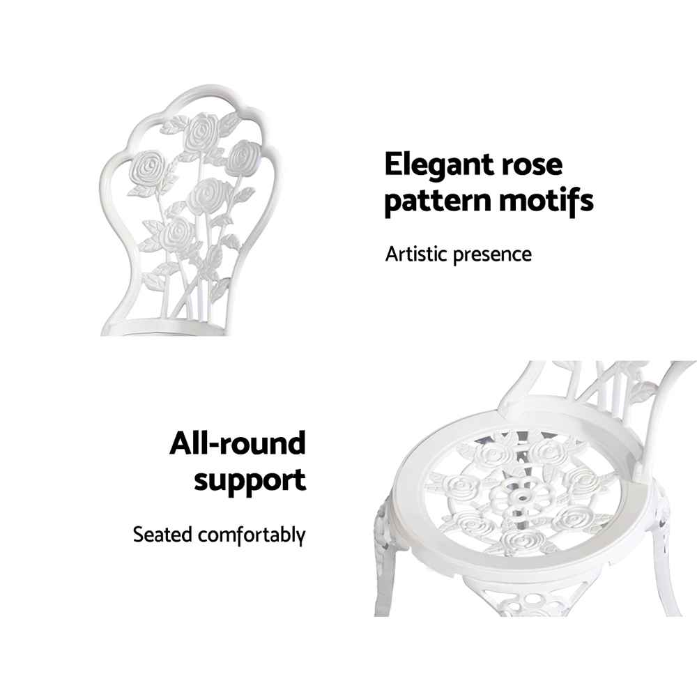 Crafted from cast aluminium and cast iron, the bistro set features a powder-coated finish that ensures exceptional rust and weather resistance, making it ideal for year-round outdoor use. The intricate detailing evokes vintage charm while maintaining a sturdy and reliable build.