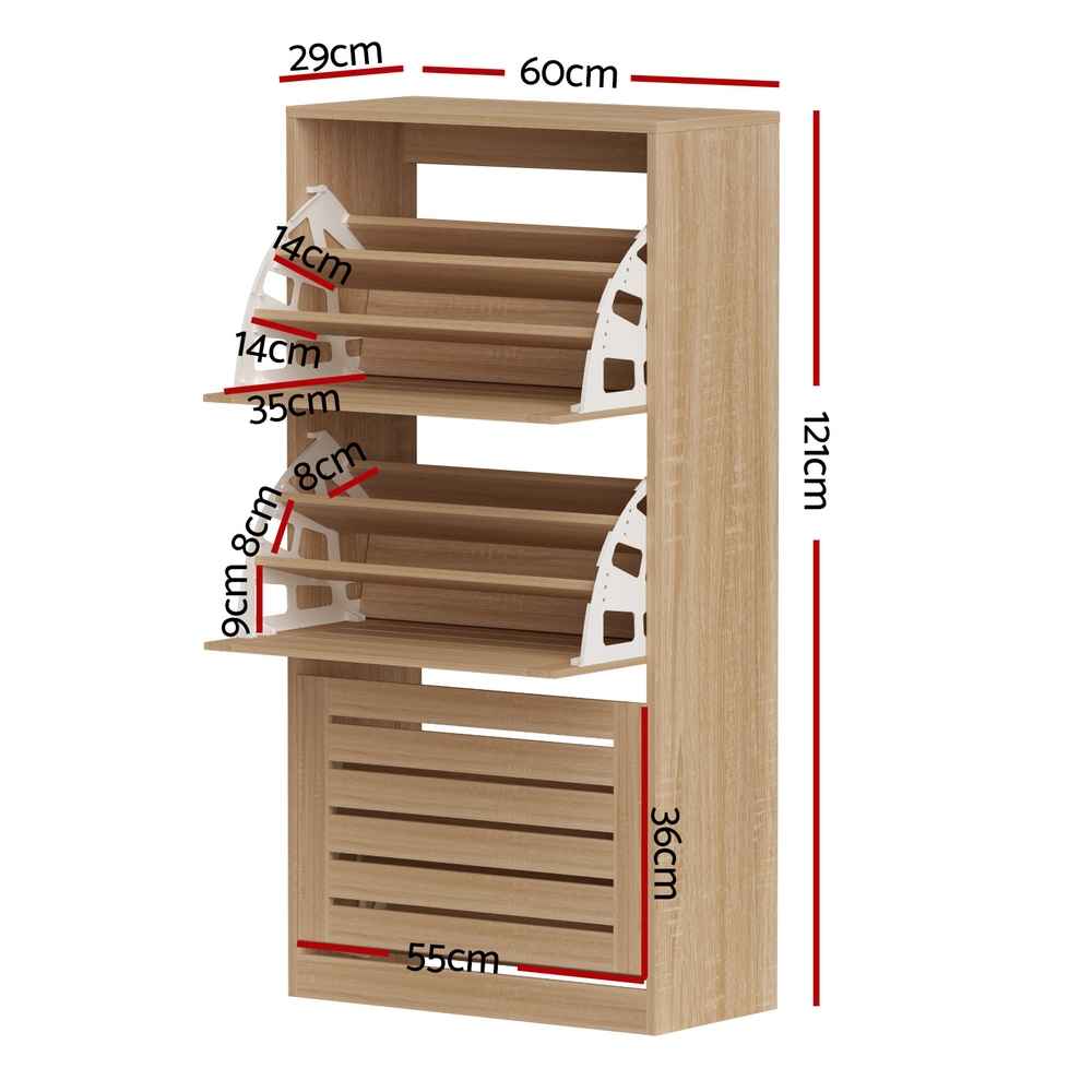 Maximise your entryway storage with this space-smart shoe cabinet, combining flip-up drawers and adjustable shelves behind ventilated slatted doors. Designed to keep your footwear organised and your home clutter-free, it accommodates a variety of shoe sizes in a stylish, contemporary package.