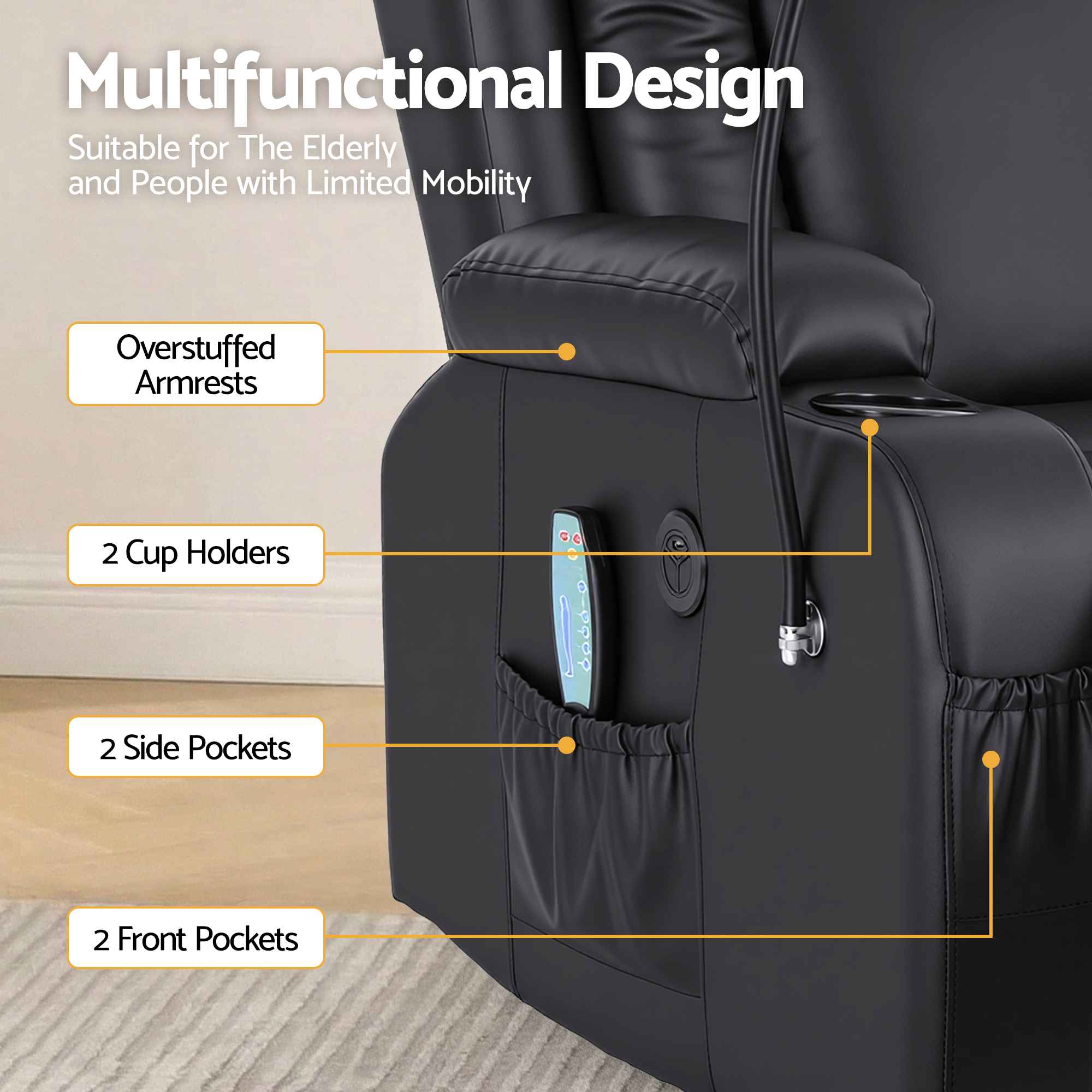 The Ascend Black Power Lift Recliner Chair is designed to bring together support, comfort and convenience in one stylish package. With automated lift assistance, reclining comfort, heated massage and thoughtful storage features, it is a smart choice for anyone looking to improve their everyday living space.