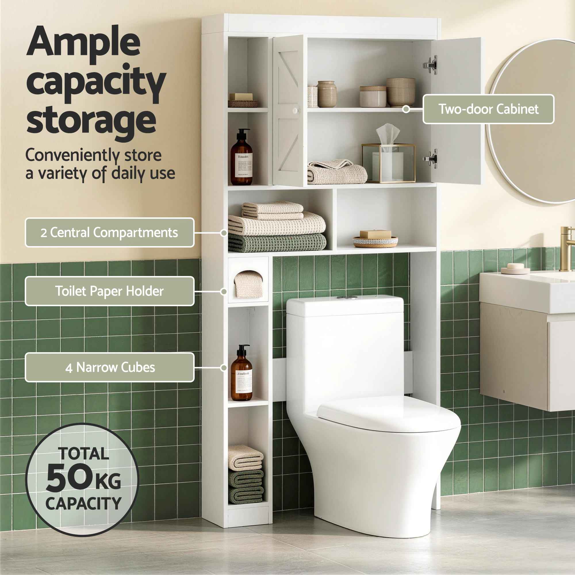 It also includes a built-in toilet paper holder with magnetic closure, making daily use more convenient while keeping essentials tidy and within reach.