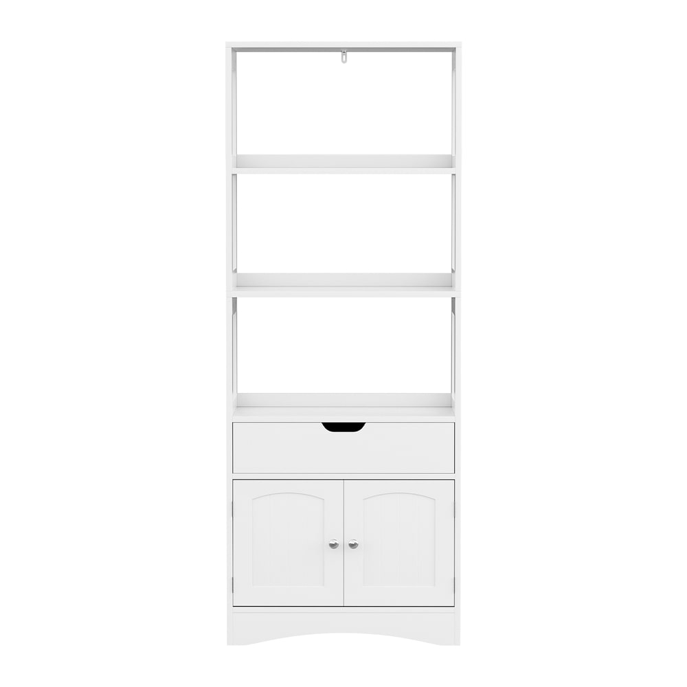 Transform clutter into a clean, organised space with this versatile bathroom storage cabinet. Designed with practicality in mind, it features three open shelves, a smooth-glide drawer with grooved handle, and magnetic-snap doors for secure closure. Whether you need extra room for toiletries, towels, or everyday essentials, this cabinet provides a compact yet generous storage solution.