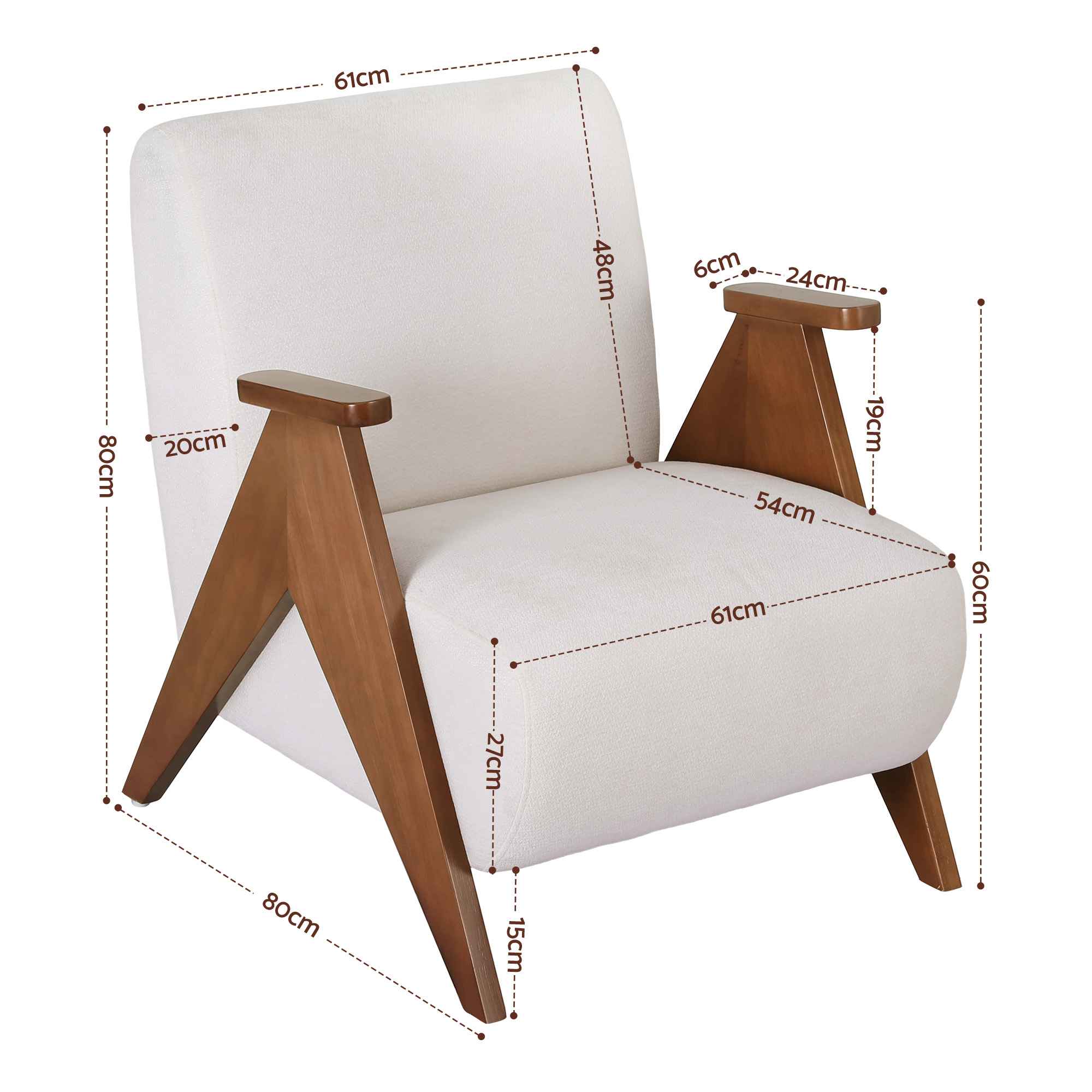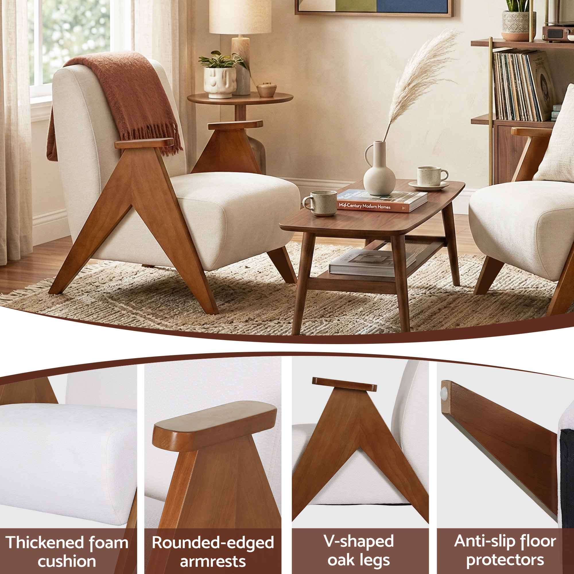 The sturdy rubber wood frame adds strength and stability, while the flared V-shaped oak legs create a refined, modern look. With anti-slip feet protectors included, this armchair is also designed to help protect your flooring.