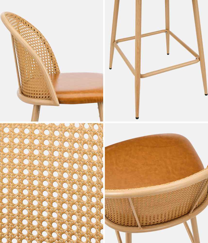 Crafted for those who appreciate both design and relaxation, this bar stool features a cosy PU leather upholstered seat with thick padding for extra comfort. The wide seating area and supportive PE rattan backrest provide the perfect balance between style and ergonomic support, making it ideal for long chats over coffee, wine, or cocktails.