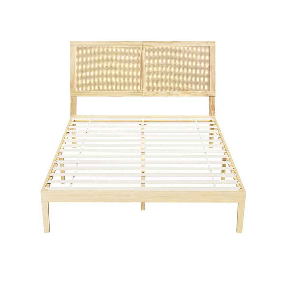 Minimalist Pinewood Bed Frame with Rattan Headboard