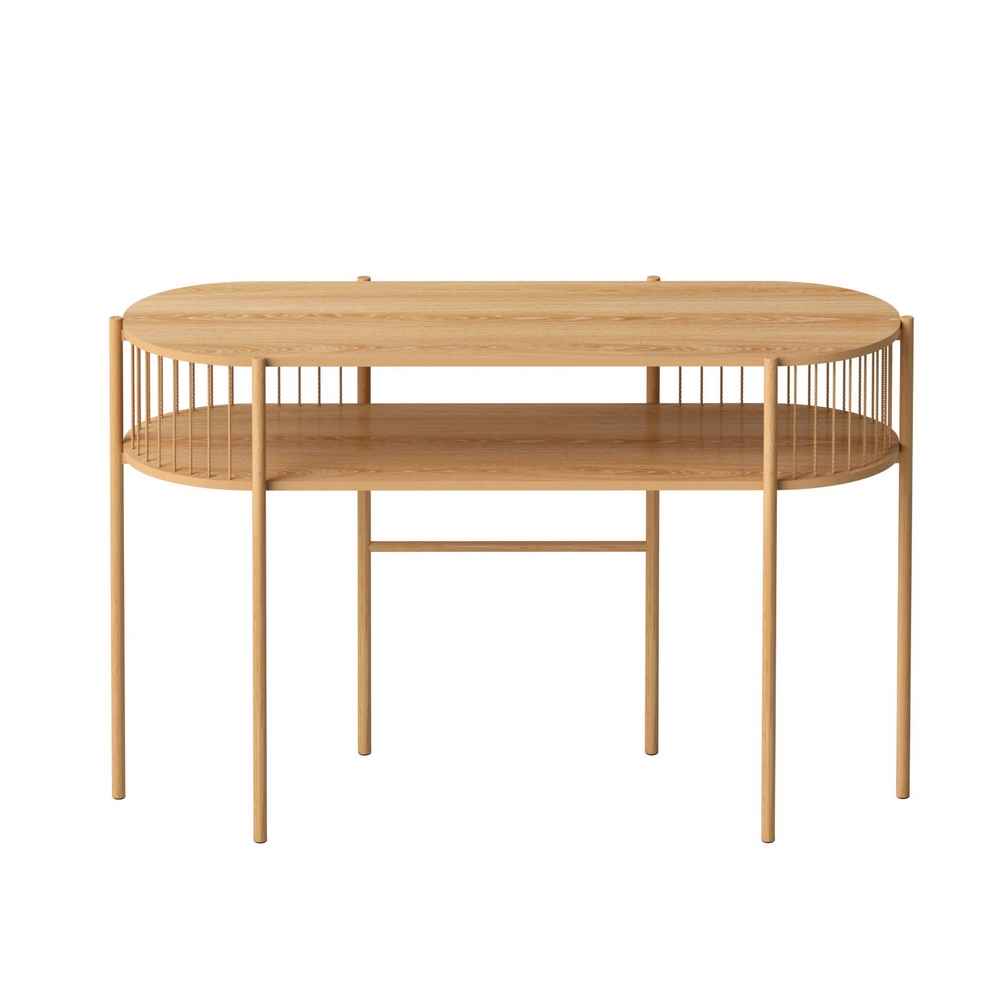 Featuring straw rope-inspired metal detailing and a durable E1 MDF tabletop, this two-tier console table offers generous storage while maintaining a slim, space-saving profile perfect for narrow areas.