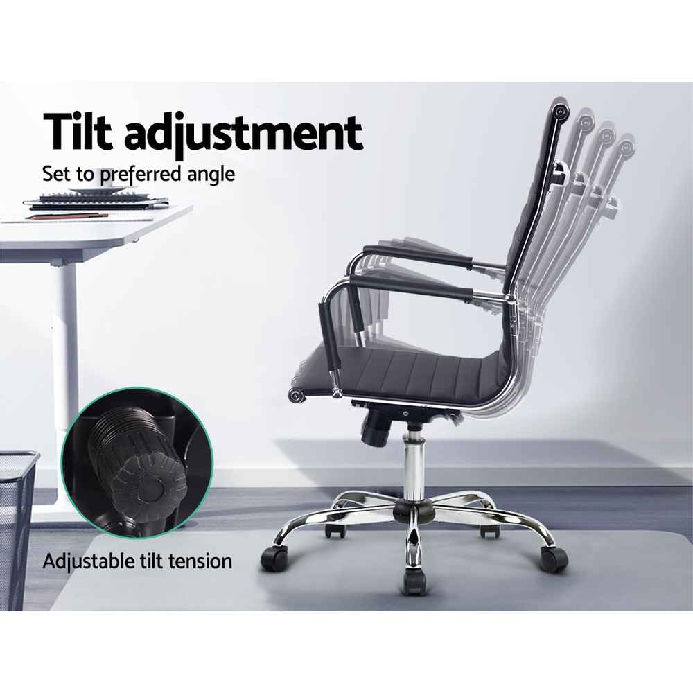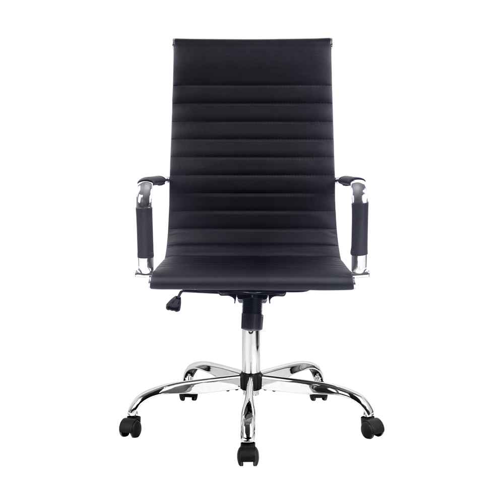 Enhance your home or office with this contemporary office chair, designed for both style and functionality. Its faux leather upholstery adds a touch of elegance, while the chrome-finished base and detailing provide a modern aesthetic.