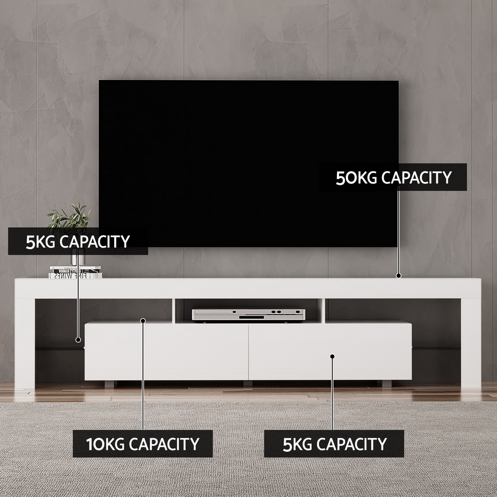 Watch television or play video games in style with our Elo LED Entertainment Unit. The ideal statement piece for media enthusiasts, you’ll wonder how you entertained without it. The unit comes with built-in RGB LED lighting that can be customised with 16 different colours and 4 different flashing modes to suit your preferences. Constructed from quality particleboard with a melamine finish, the unit is built for long-lasting use. The high-gloss front is perfectly smooth, making it a beautiful aesthetic piece that is also easy to clean. The two drawers have a handle-less design to maintain the sleek appearance and they provide ample storage for all your entertainment paraphernalia. Five open shelves let you put your favourite pieces on display, illuminated by your favourite LED light spectrum. The Elo LED Entertainment Unit will be the perfect addition to any modern living room. The future is now – get yours today.