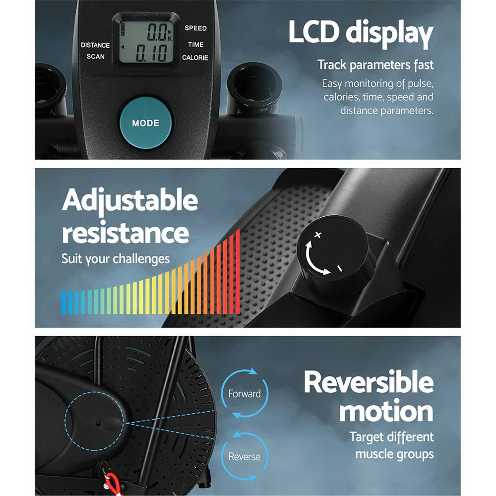Elliptical cross trainers are excellent fitness machines for individuals who demand a training regime that works on all muscles and yet eliminates the risk of impact injuries such as treadmill running or walking. Hence the trainers are particularly helpful for those with joint problems with knees and feet. Our Elliptical Bike is a very efficient low-impact cross trainer that offers adjustable mechanical resistance to tone every muscle in your body. The easy-to-read LCD display lets you keep track of your training parameters. The industrial-strength powder-coated steel frame is strong and sturdy and the large seat is comfortable with every stride. Other great features include rubber-clad pole grips, reversible two-way movement, mode changes within 30 seconds and adjustable handlebar height and seat. Not least, the elliptical bike allows you to exercise whenever you want, anytime and anywhere.