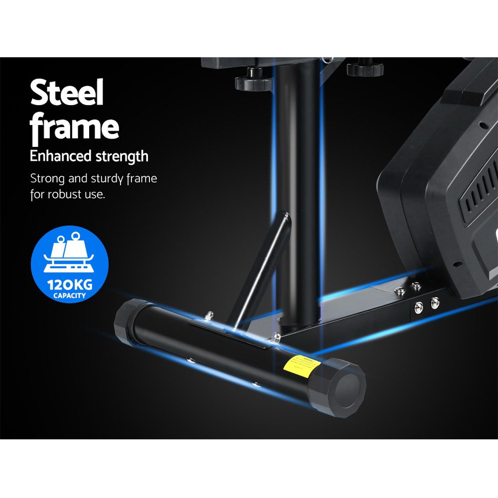 Get an effective workout in the comfort of your home while watching TV or listening to your favourite music. The Recumbent Exercise Bike is just perfect to have all these at once. Designed for people who prefer a low or non- impact exercise regime, our recumbent bike provides adequate exercise for the body without causing undue stress and strains on your joints and back. The relaxed seating position actually allows you to balance your body weight better and get your legs and heart to work together in tandem for better blood flow. The LCD display also helps to track parameters easily to let you monitor your health while exercising. The bike itself is constructed of an industrial-strength power-coated steel frame for durability and rust resistance. With up to eight resistance levels, the bike can be adjusted for the desired exercising intensity to suit your workout. Plus, the magnetic flywheel is smooth and runs almost friction-free. Other features include an adjustable seat length, wide and comfortable seat and non-slip protective feet. Not least, the recumbent bike is also easy to transport with two handy wheels for hassle-free moving.