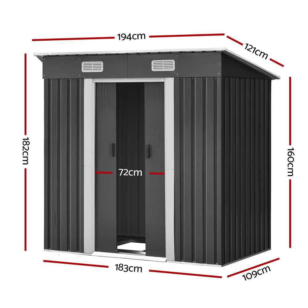 Step inside and you’ll find ample storage space with plenty of room to move around. Four built-in air vents promote consistent airflow, preventing moisture build-up and maintaining a fresh interior. Double sliding doors allow smooth, unobstructed entry so you can easily move larger tools, garden carts or equipment in and out.