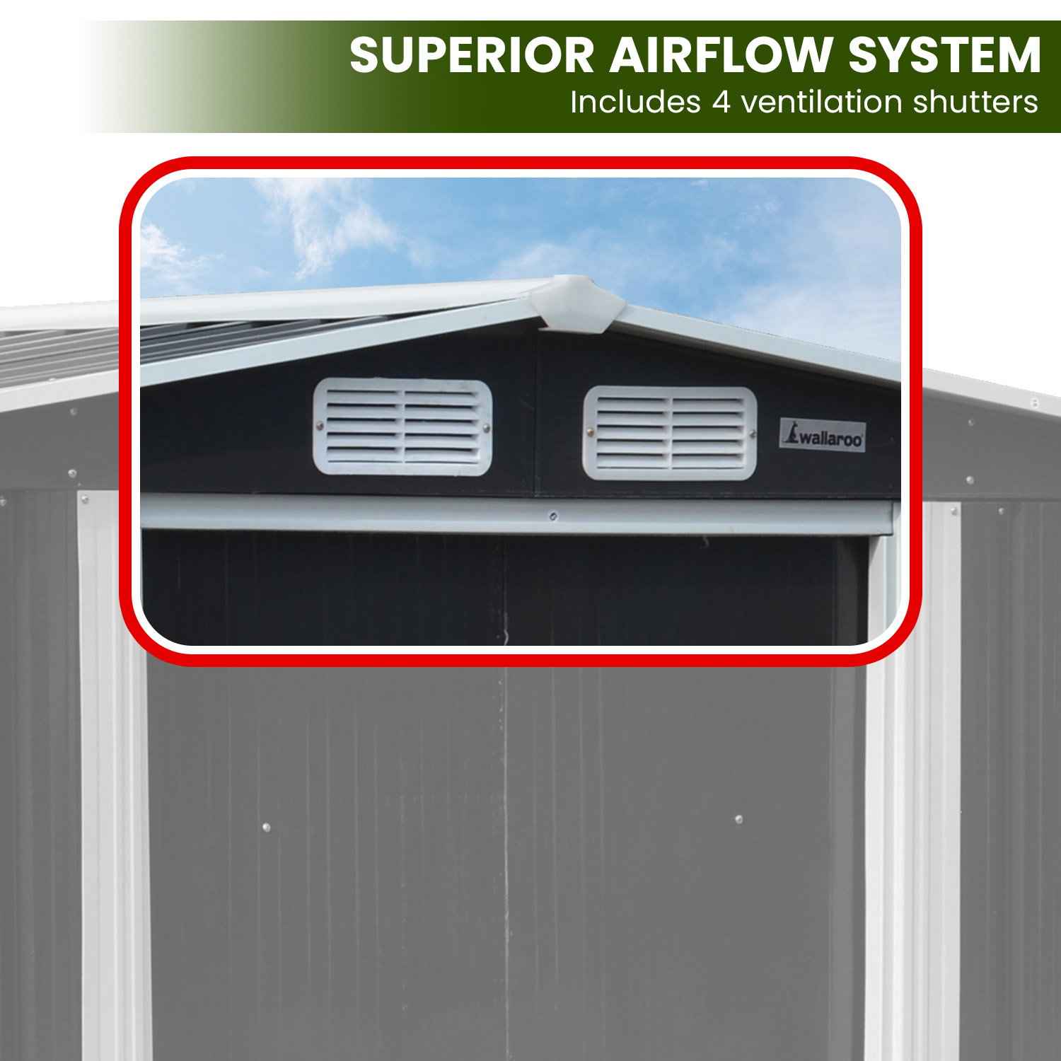 Four built-in ventilation shutters improve airflow throughout the shed, helping to reduce moisture build-up and unwanted odours. This keeps your stored items dry, protected and ready to use whenever you need them.