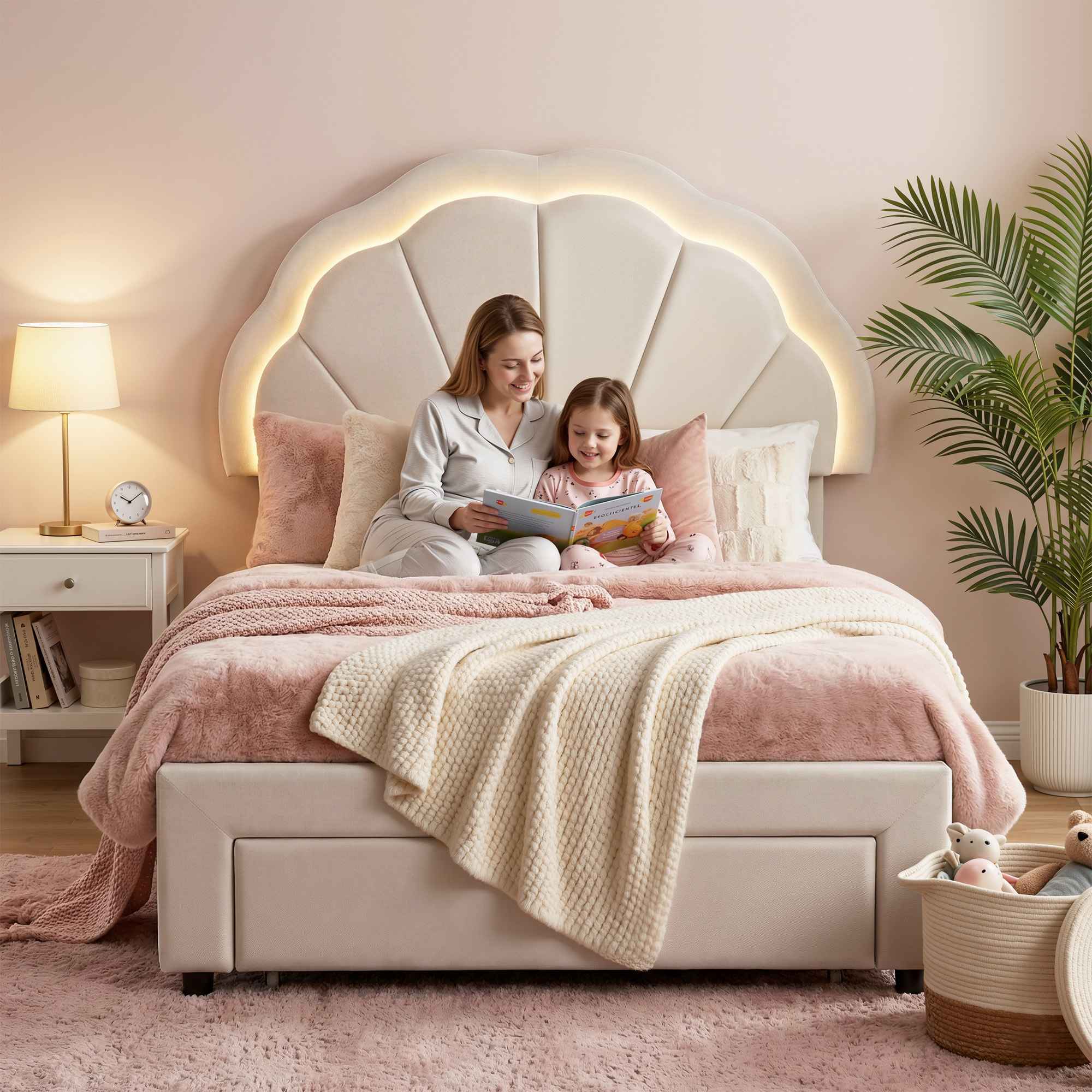Built-in LED mood lighting creates a warm, relaxing bedroom feel