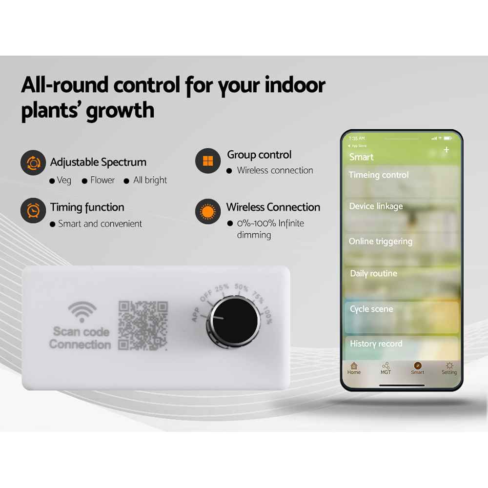 Using Samsung LM281B diodes and a Sosen driver, the 220W grow light offers strong light output, high energy efficiency and lower running costs compared with many traditional grow lights. The smart app control also makes it easier to adjust timing, dimming and spectrum settings from your phone.