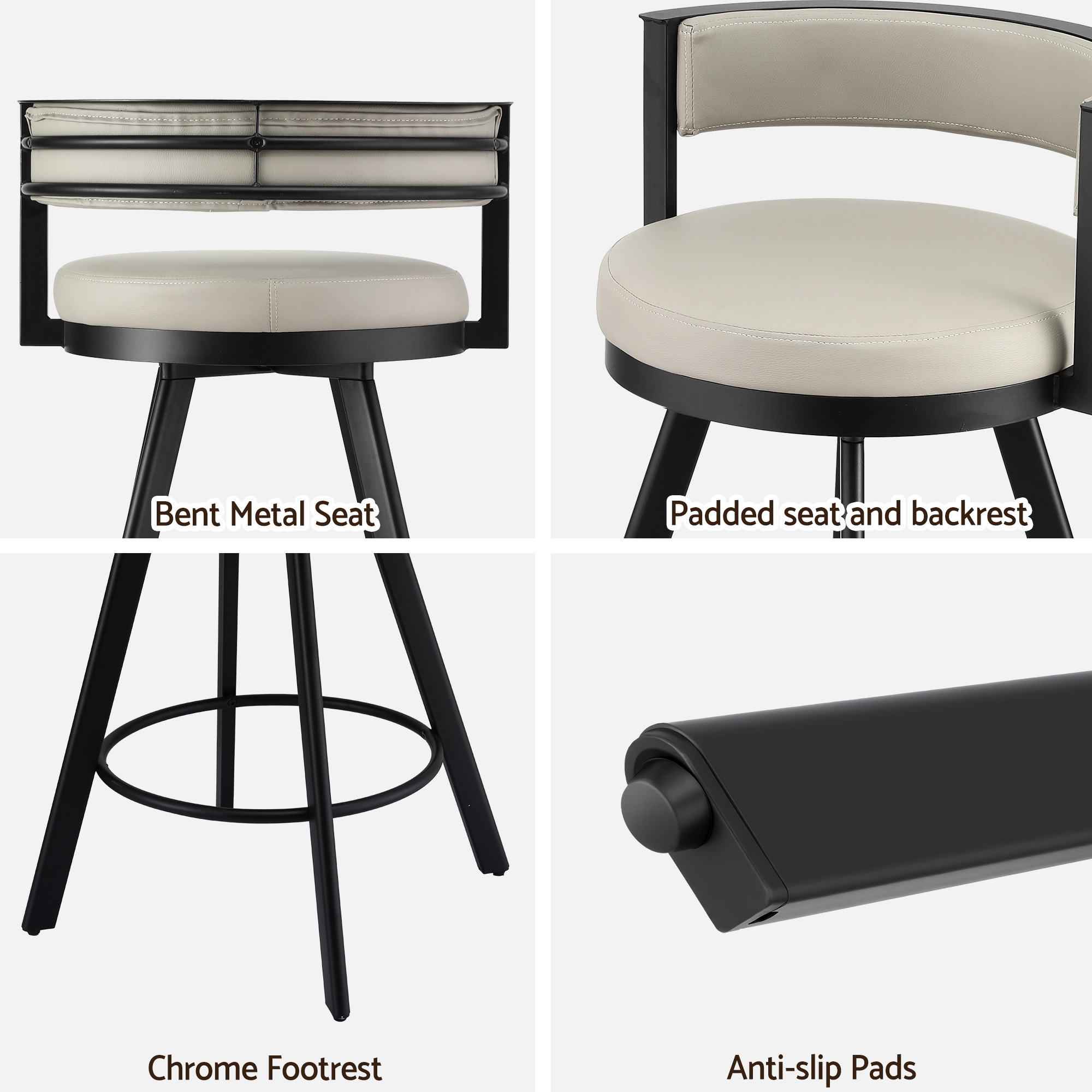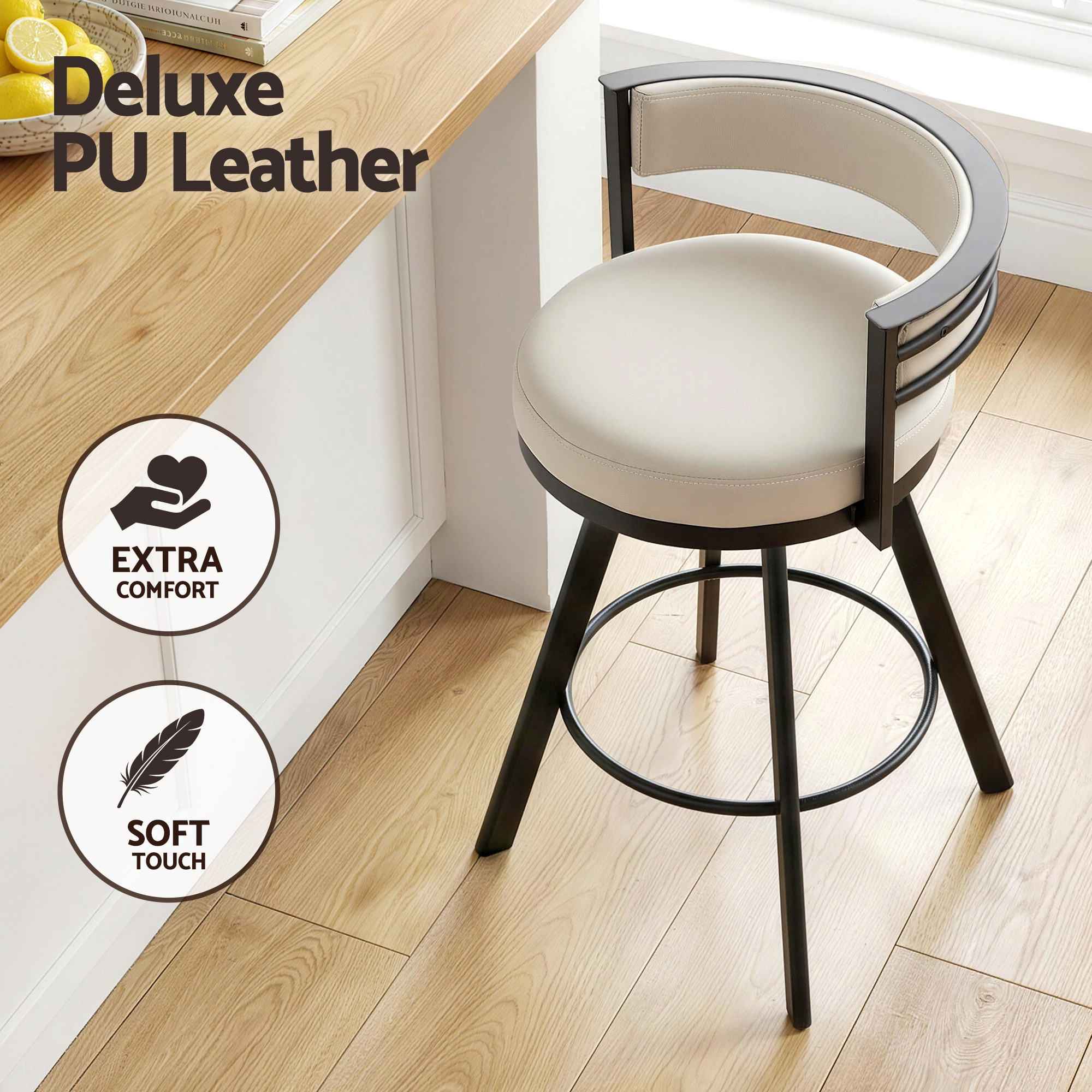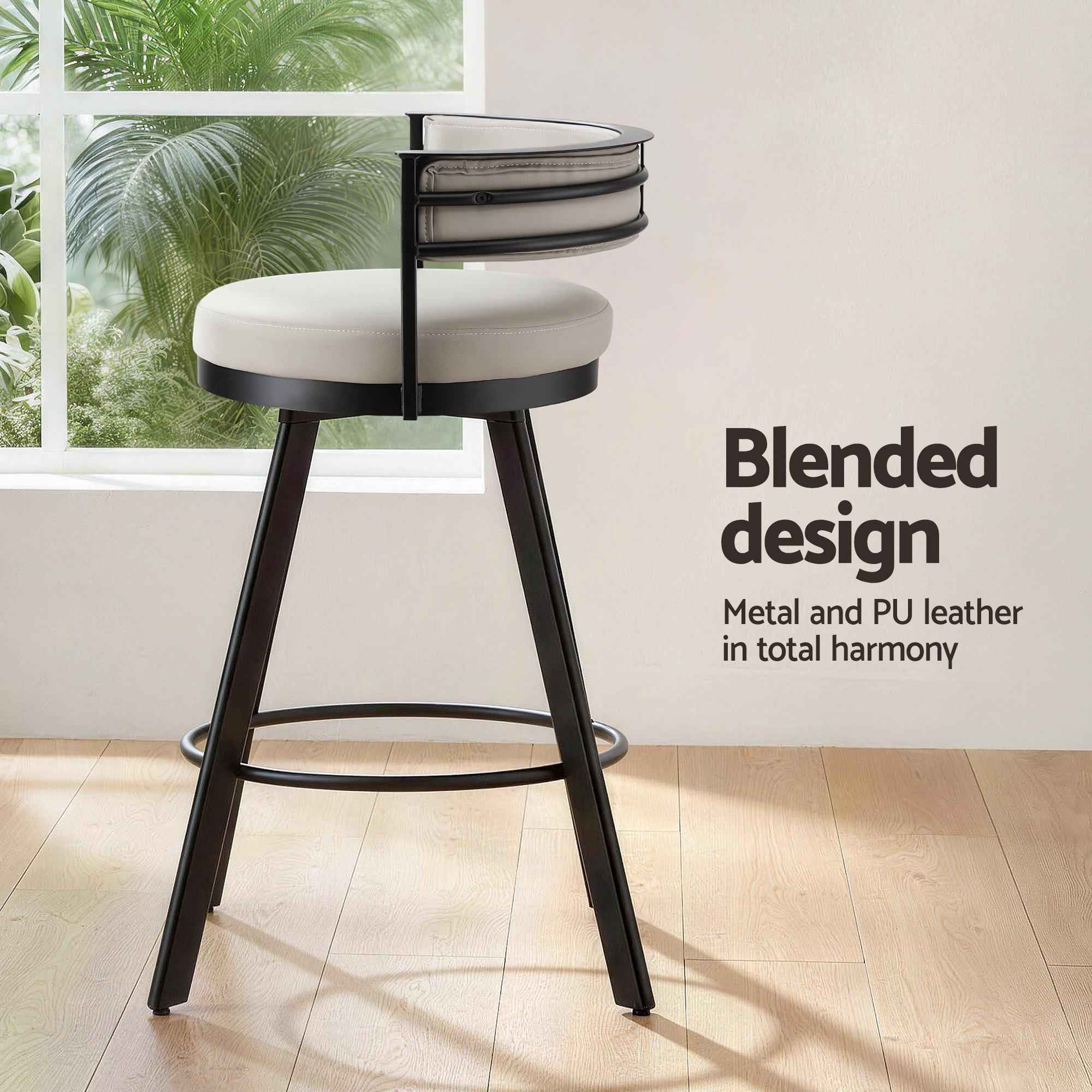 With deluxe PU leather upholstery in a versatile beige tone and a sturdy black metal frame, these swivel bar stools offer a clean industrial-inspired look that suits a wide range of home and commercial spaces. Whether placed at a kitchen bench, home bar or café setting, they are made to deliver comfort, durability and easy maintenance.