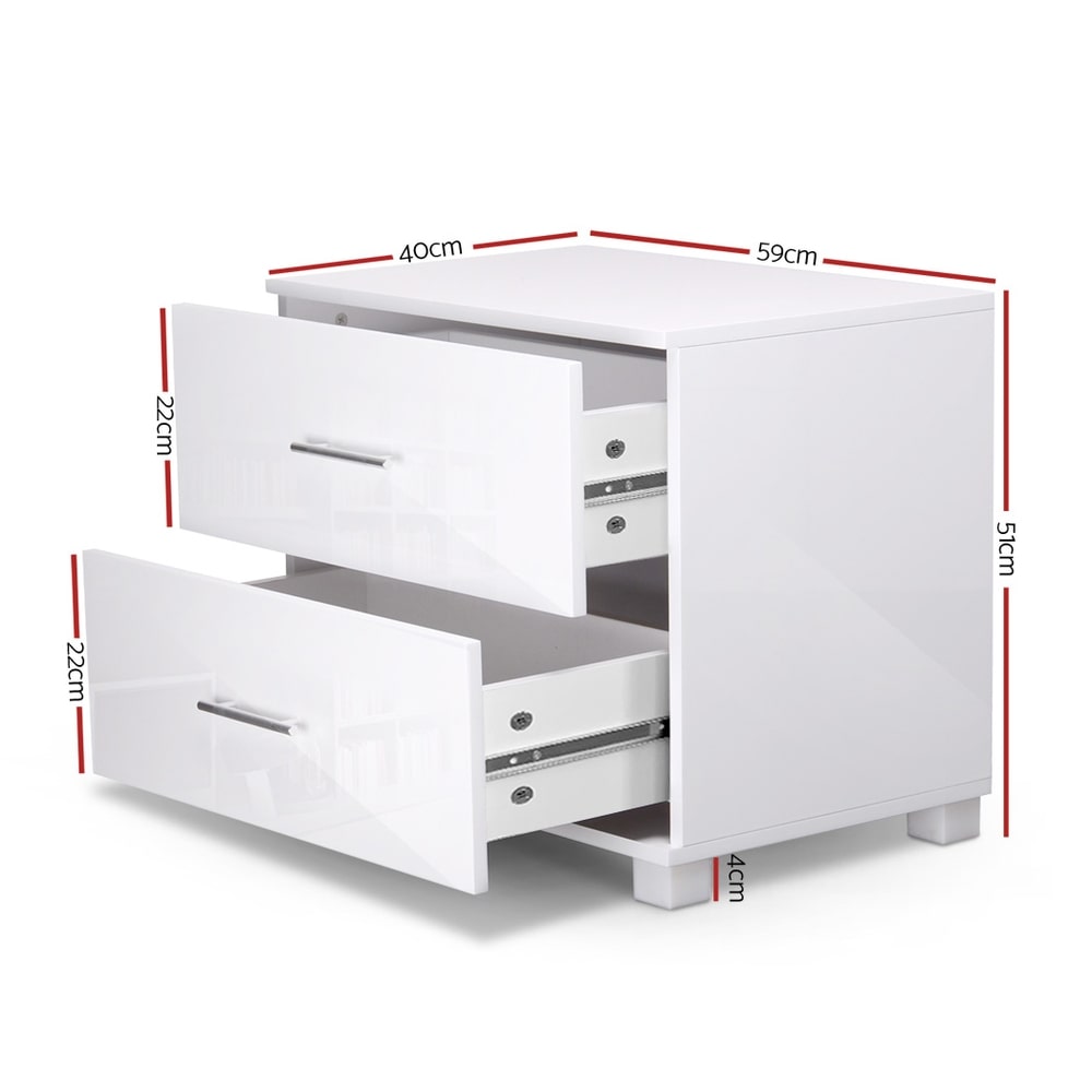 Our modern bedside table is designed to combine elegance and practicality, featuring a high gloss UV finish and sleek aluminium handles. Crafted from durable 15mm MDF and particle board, it is built to last and comes with quality components like anti-rust metal drawer runners and a reinforced base.