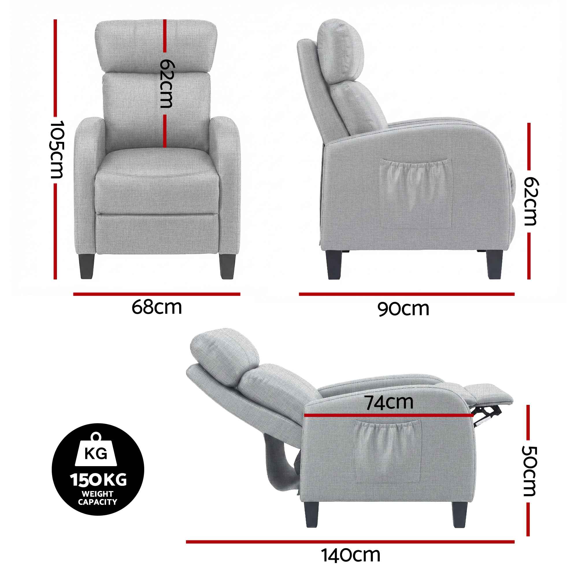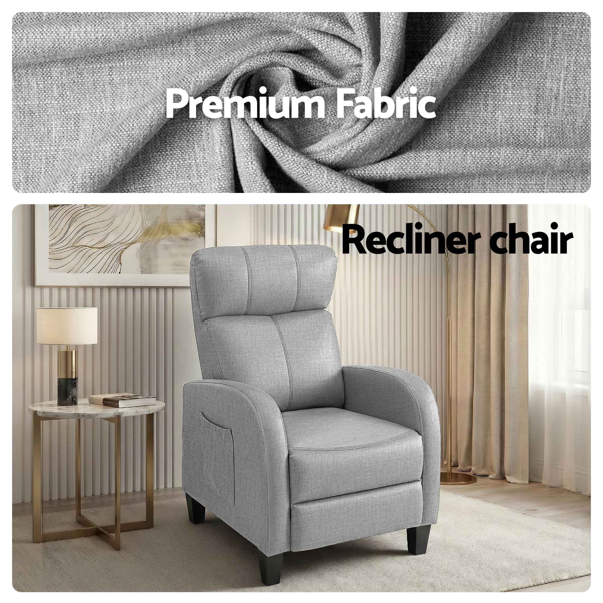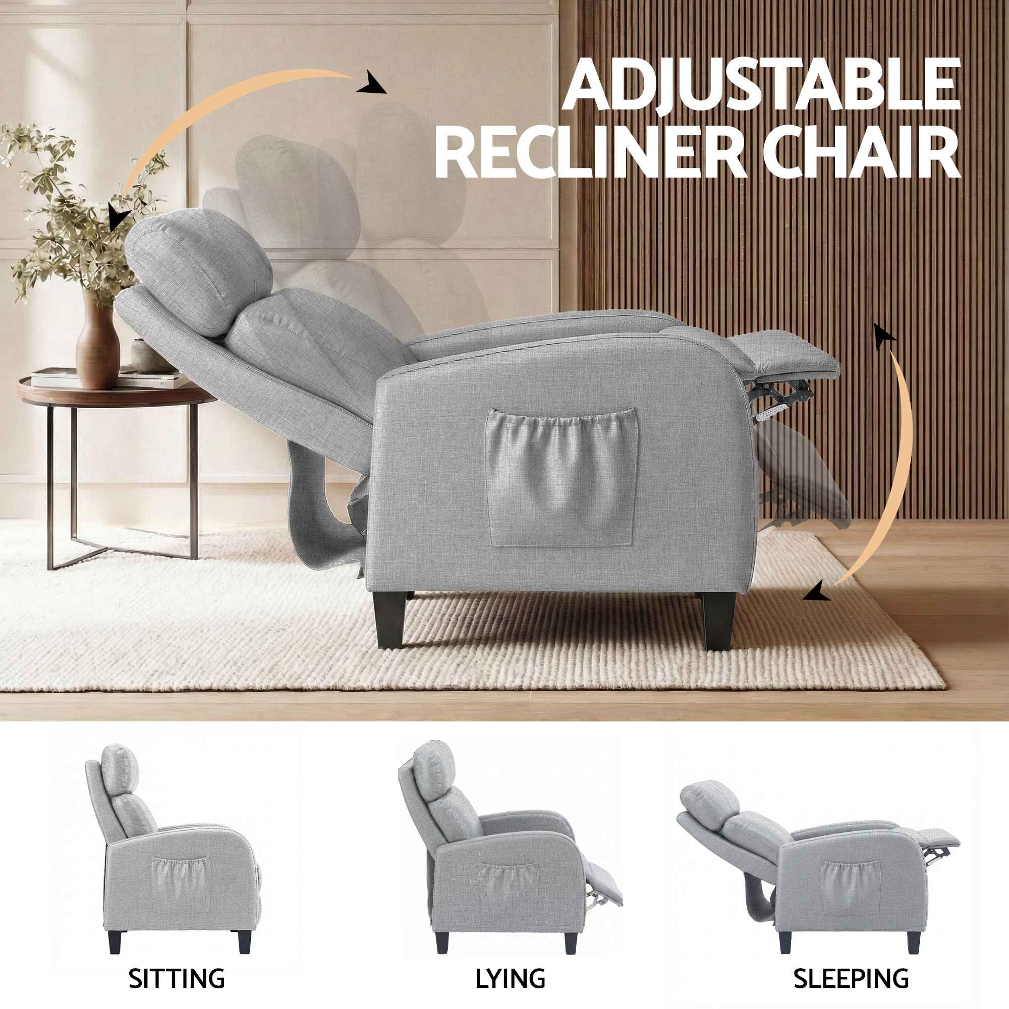 Ideal for the living room, bedroom or reading corner, this recliner chair offers a practical balance of comfort, support and style. With its soft grey fabric upholstery, generous padding and handy storage pockets, it is a smart choice for modern Australian homes.