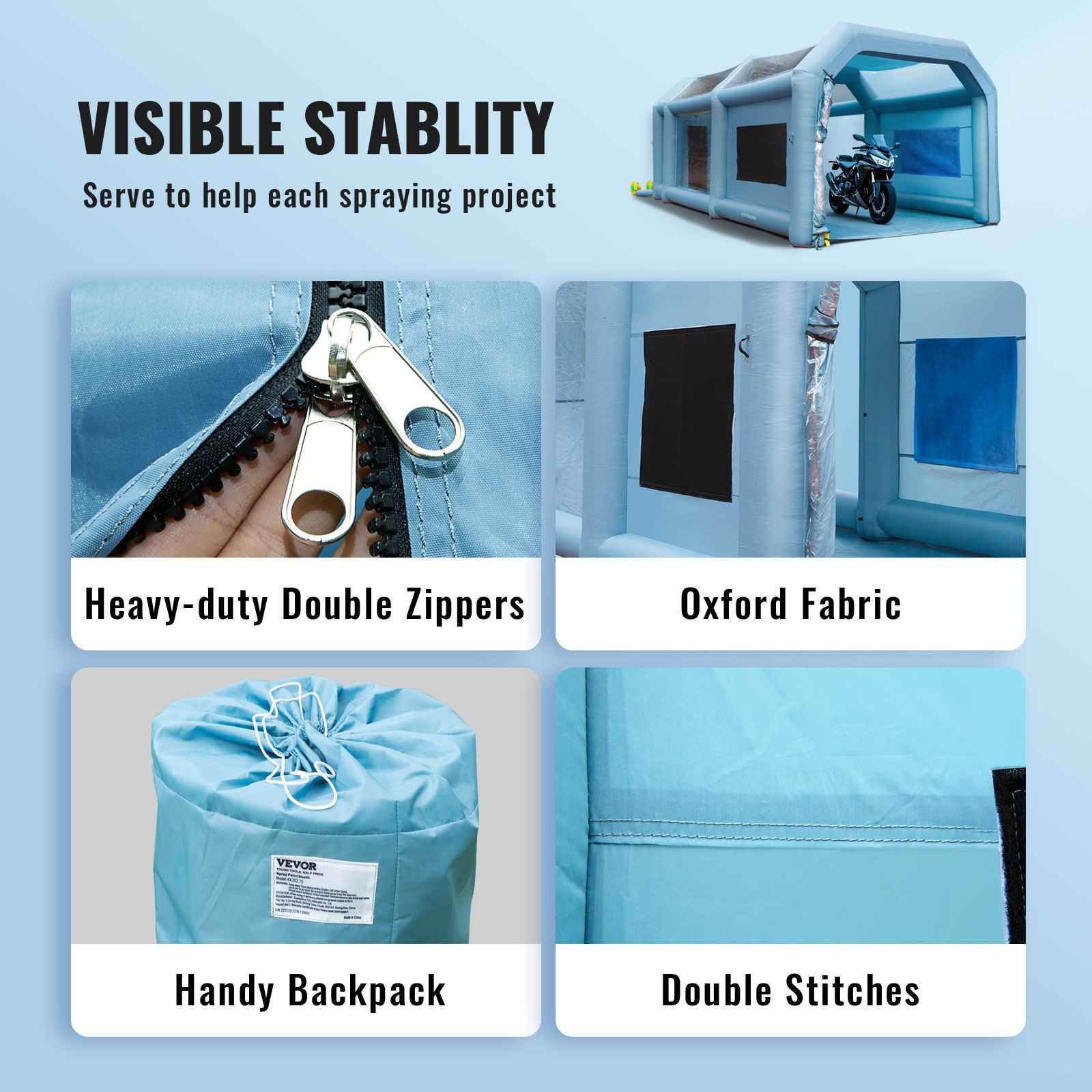 The inflatable paint booth by VEVOR is made from thickened 201D Oxford cloth with PU coating combined with 4mm PVC material, delivering durability and improved resistance to dirt and wear. This sturdy material combination makes it suitable for repeated setup, pack-down and regular use in home or trade environments.