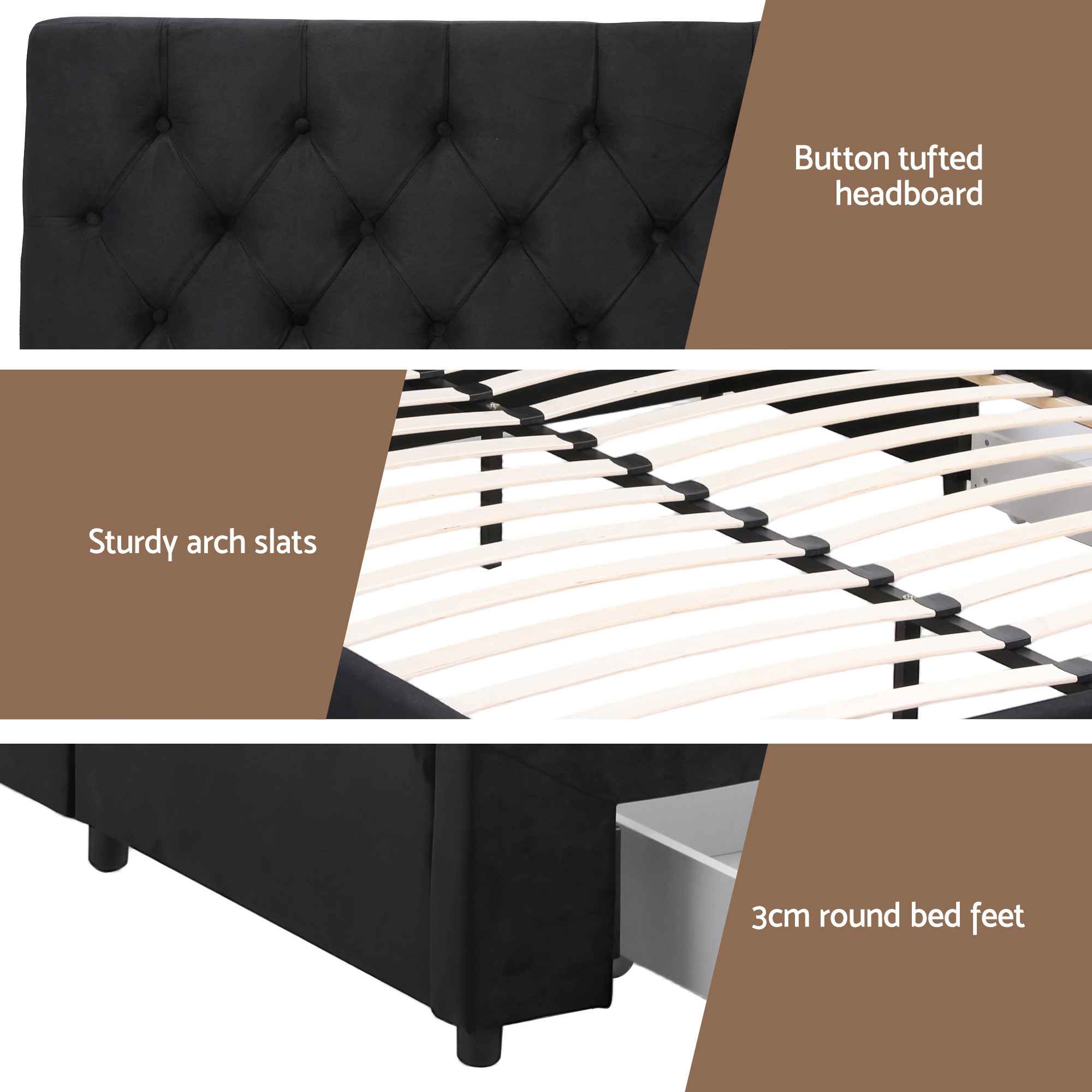 This velvet upholstered bed frame balances comfort, durability and visual appeal. The button-tufted headboard adds a timeless detail, while the clean-lined design suits modern, minimalist or contemporary interiors.