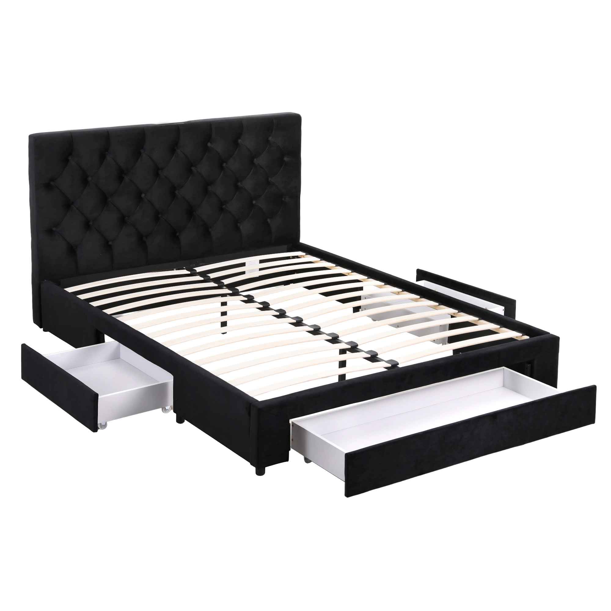 Double Upholstered Bed Frame with Storage Drawers and Charging Station