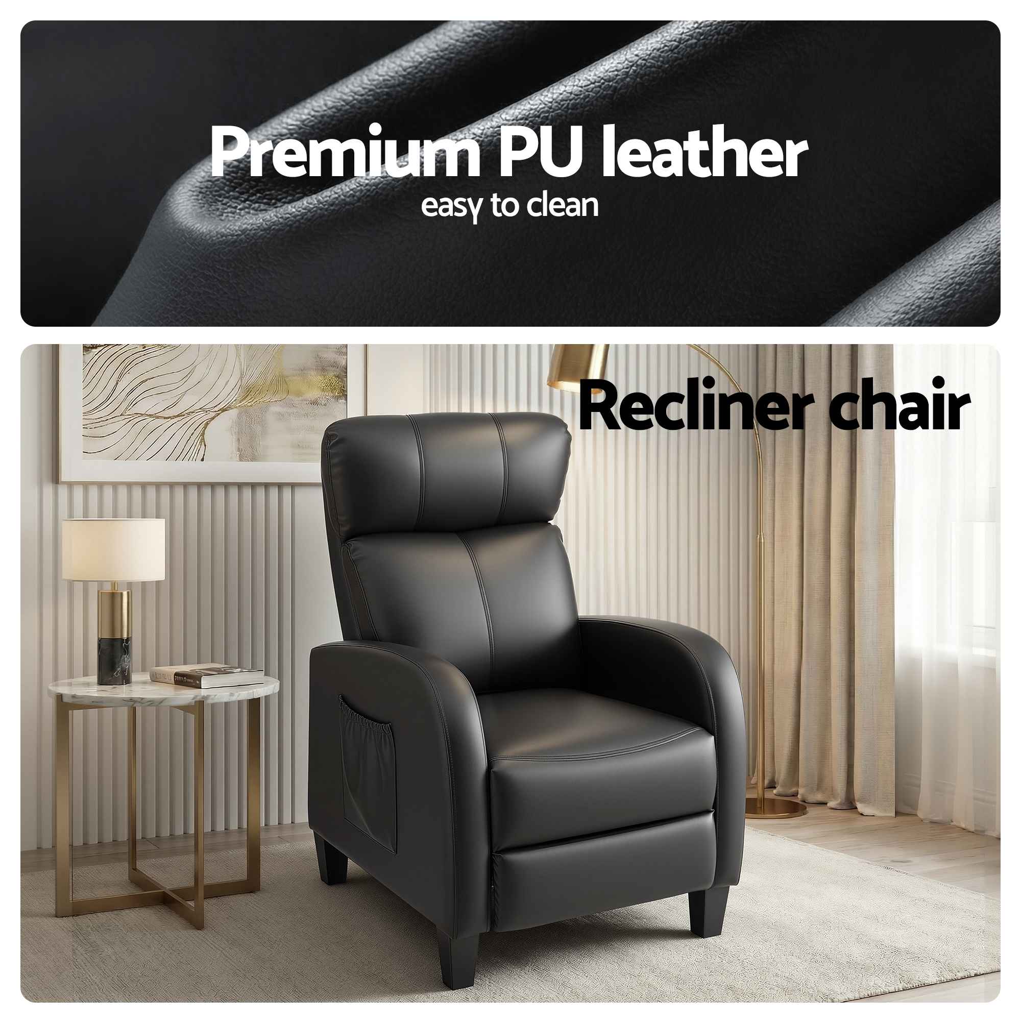 The PU leather upholstery gives this recliner a sleek and modern look while also making it easy to maintain. The surface is designed to be practical for everyday living, especially in busy households where easy cleaning matters.