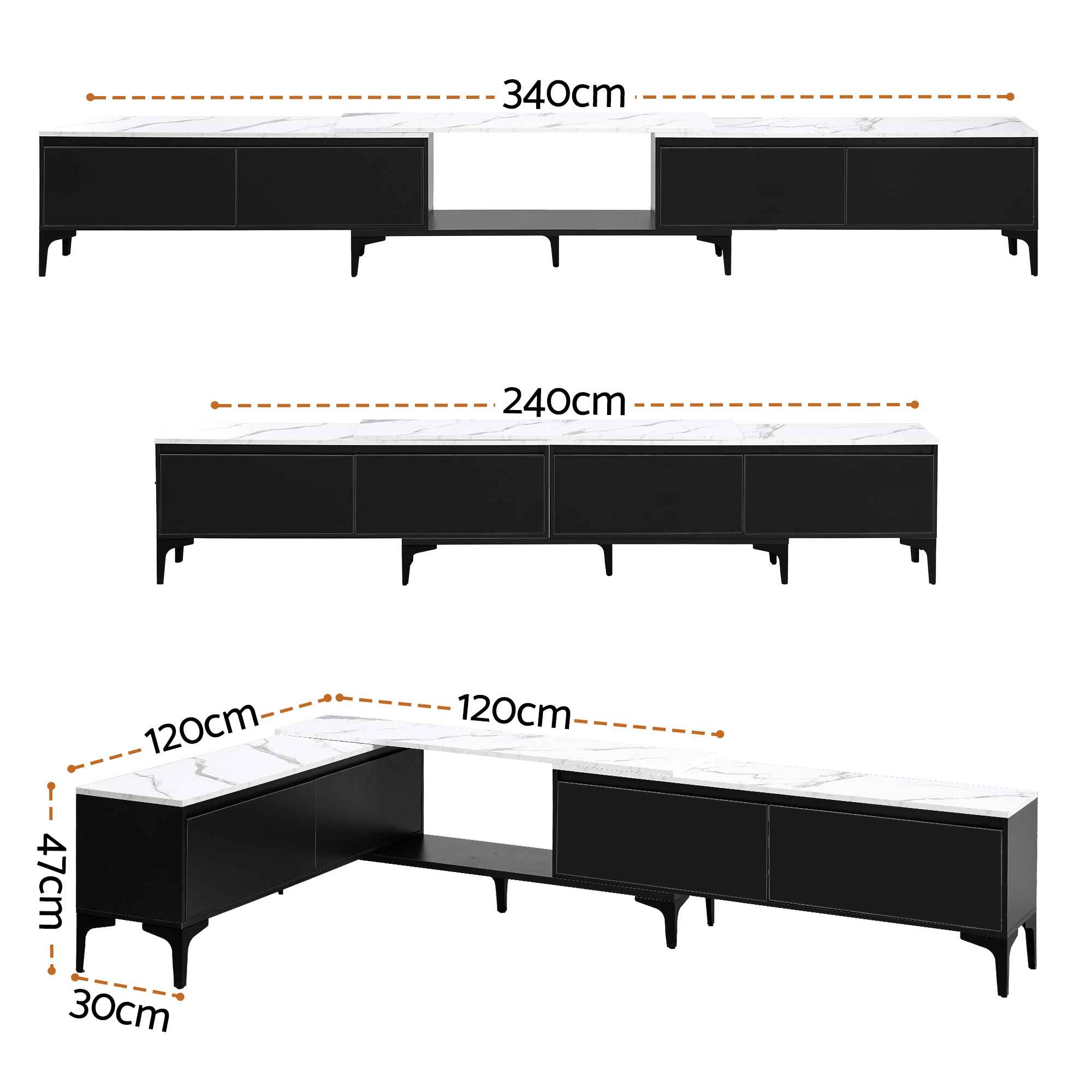 - Overall dimensions: 240cm to 340cm x 30cm x 47cm