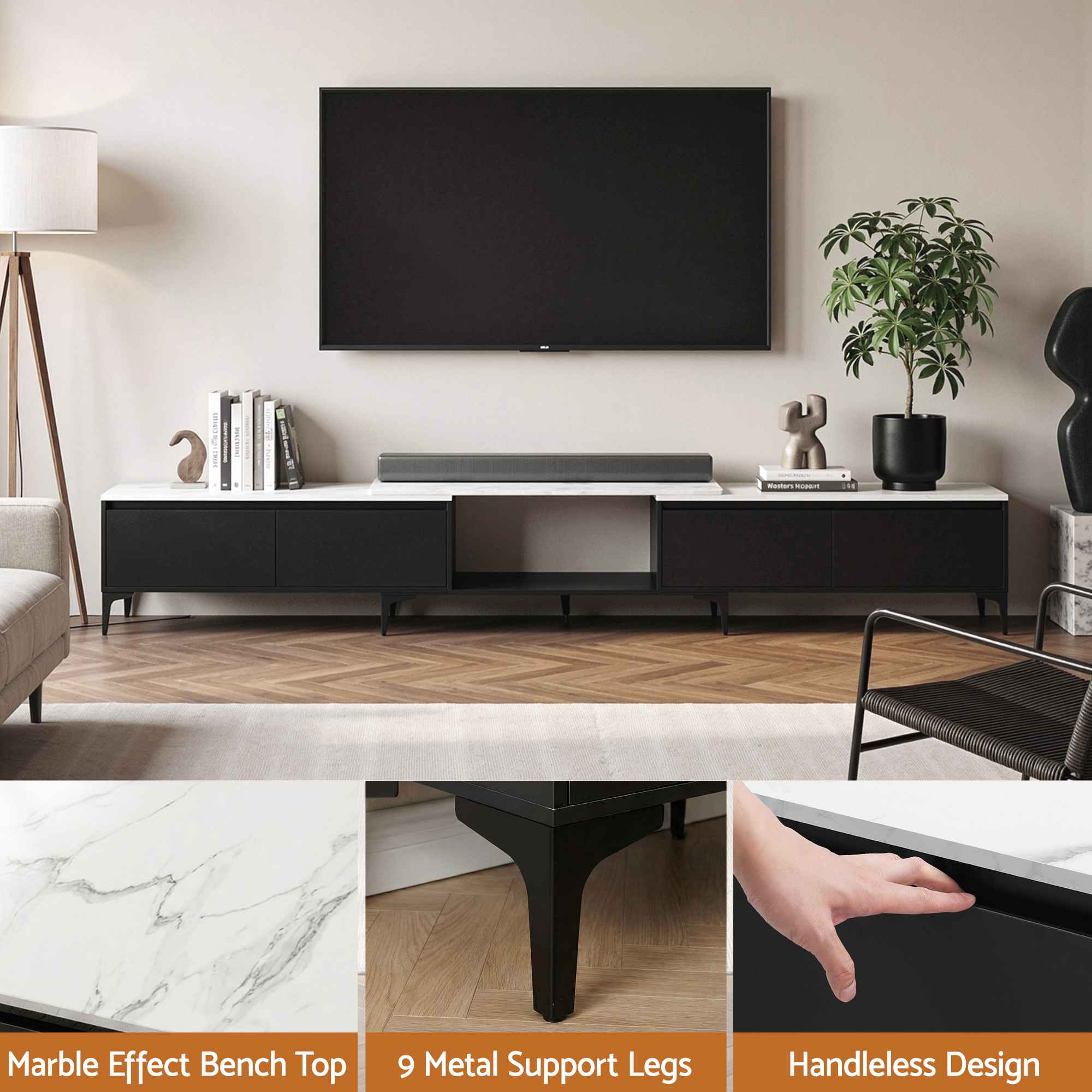 Its low-profile silhouette, handleless finish and spacious marble-effect top make it a stylish centrepiece for contemporary lounges, media rooms and open-plan living areas.