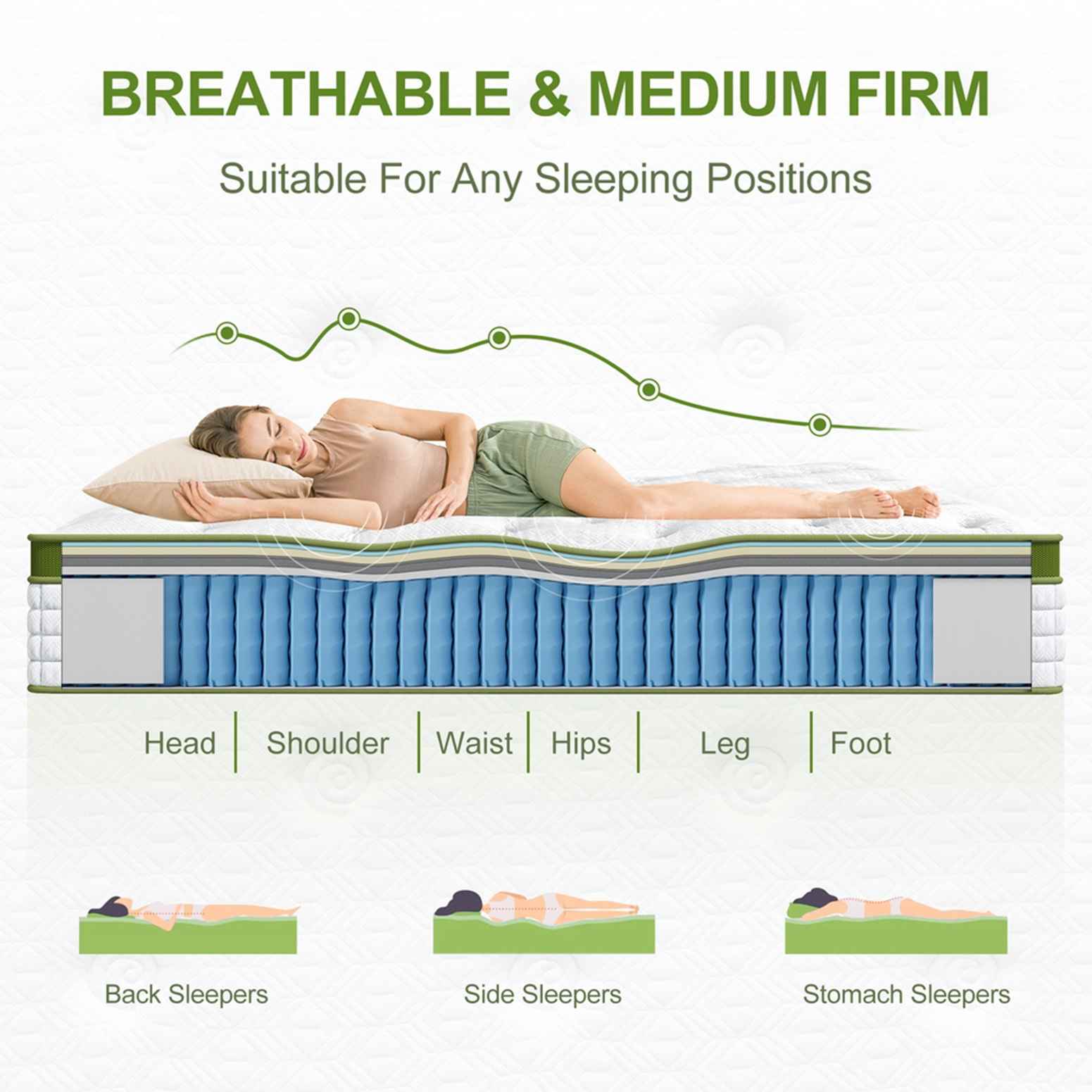 The included hybrid mattress arrives conveniently boxed and offers medium firm support with pocket coil technology for reduced motion transfer and balanced pressure relief.