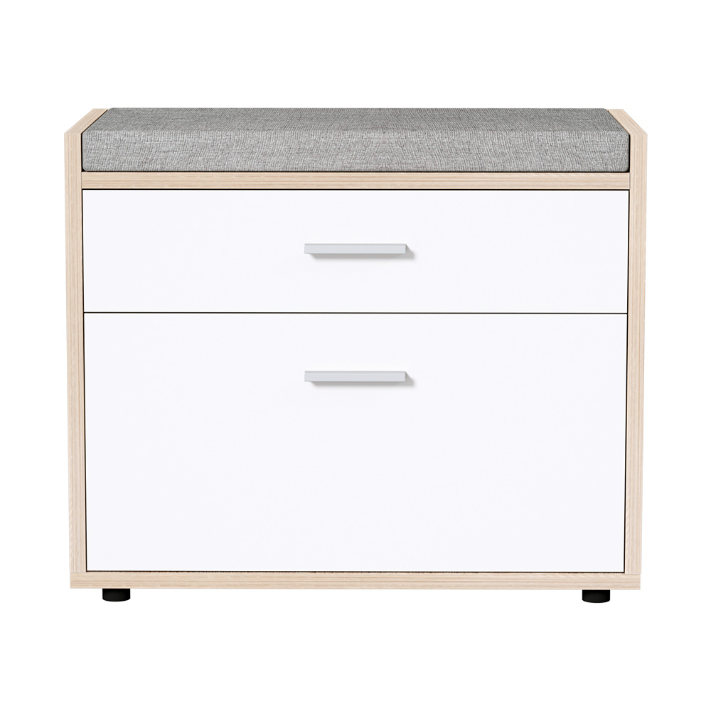 Get yourself a shoe storage cabinet with an aesthetic difference. Our Shoe Storage Bench blends two functions into one elegant piece. On first impression, it looks just like a plush stool. Pull down the bottom cabinet door and you find two tiers of shelves with ample space for 6 to 8 pairs of various footwear. Plus, the panel in the middle is adjustable or removable for bigger shoes. There is also a spacious top drawer with smooth anti-rust runners for all your other footwear essentials such as shoe polish and spare shoelaces. Made from quality particle board, the bench is sturdy and finished in smooth paper veneer for durability and easy maintenance. Best of all, its thoughtful design means that you can place it in your hallway or entrance for a neat and tidy look that blends seamlessly with your home décor. So remove the clutter and get organised with our shoe storage bench. We are sure it will feet right in with your discerning taste for all things stylish and chic.