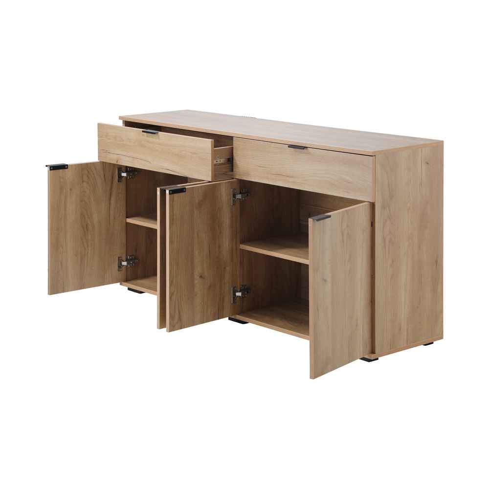 With two spacious drawers and a four-door cabinet with tiered shelving, this sideboard offers ample room to keep household essentials organised and out of sight. The expansive top surface is perfect for displaying family photos, artwork, or decorative accents that showcase your personality.