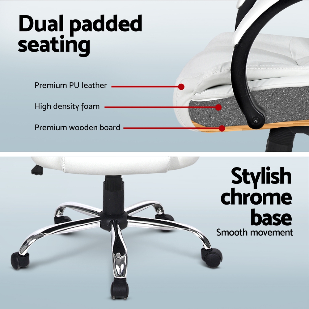 Paired with the desk is an office chair upholstered in PU synthetic faux leather for a sleek, professional look. Designed for all-day comfort, it features a high back, multi-layer padded seat, and cushioned headrest and armrests. The tilt adjustment and gas lift allow for customisable positioning, while the 360° swivel and durable chrome base with five castor wheels ensure smooth movement. Functional and stylish, this combo is perfect for any workspace.