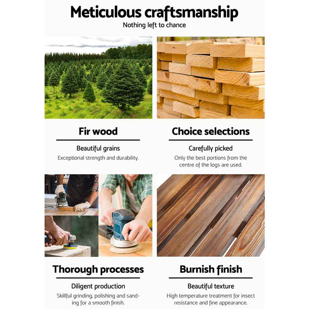 The burnt wood finish enhances the natural grain of the Fir wood, giving the bench a charcoal brown tone with a worn-in, heritage look. This finish not only adds visual depth but also complements a wide range of garden styles, from country and farmhouse to rustic contemporary.