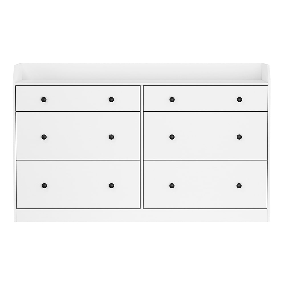 Upgrade your storage with this contemporary white chest of drawers, designed to combine functionality and modern style. Crafted from high-density particleboard, it offers long-lasting durability while keeping your space clutter-free. The six spacious drawers feature smooth-glide mechanisms and anti-rust-coated runners for effortless use. Plus, the generous top shelf provides extra space for decor or daily essentials.