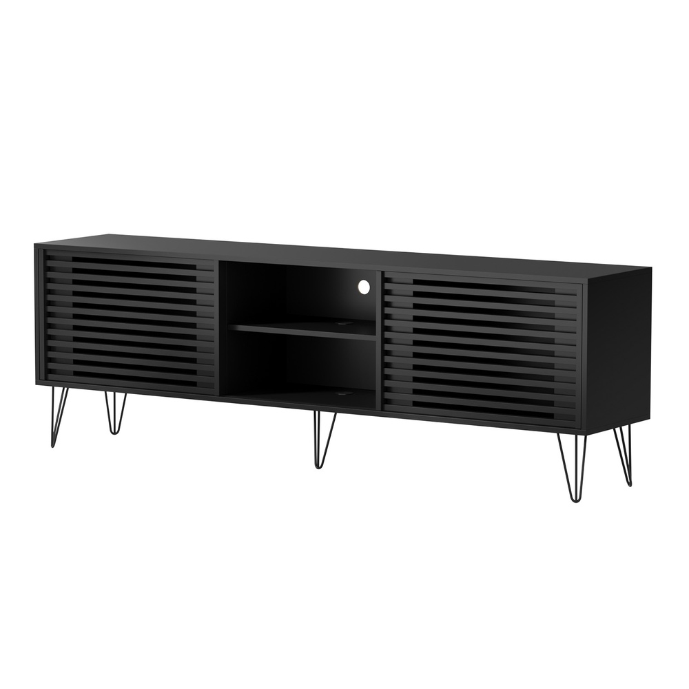 The two closed interior spaces with large louvred handle-less cabinet doors at both ends of the unit are cavernous and offer plenty of room for all your entertainment paraphernalia while the central two open shelves add complementary storage with equally spacious offerings. Better still, built-in cable openings behind the two central open shelves allow for easy connection of your media devices as well as ensuring neat and tidy cable management.