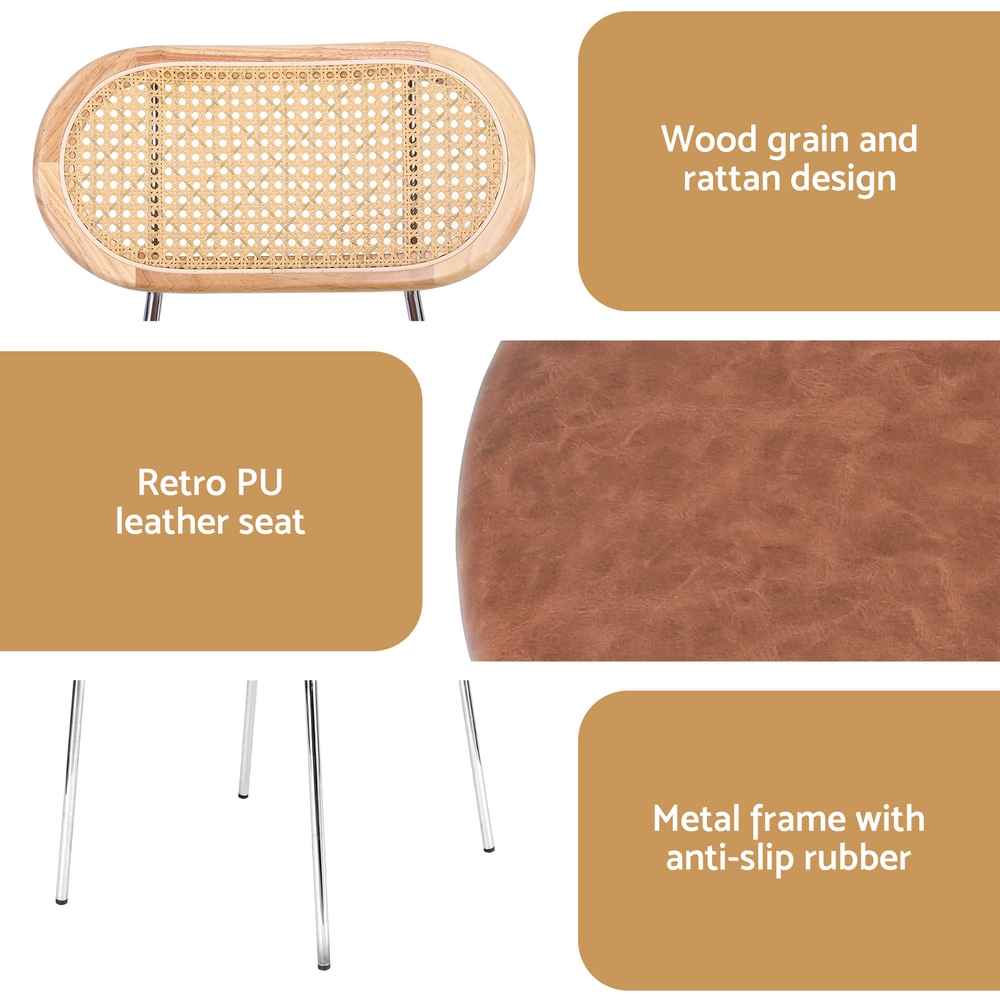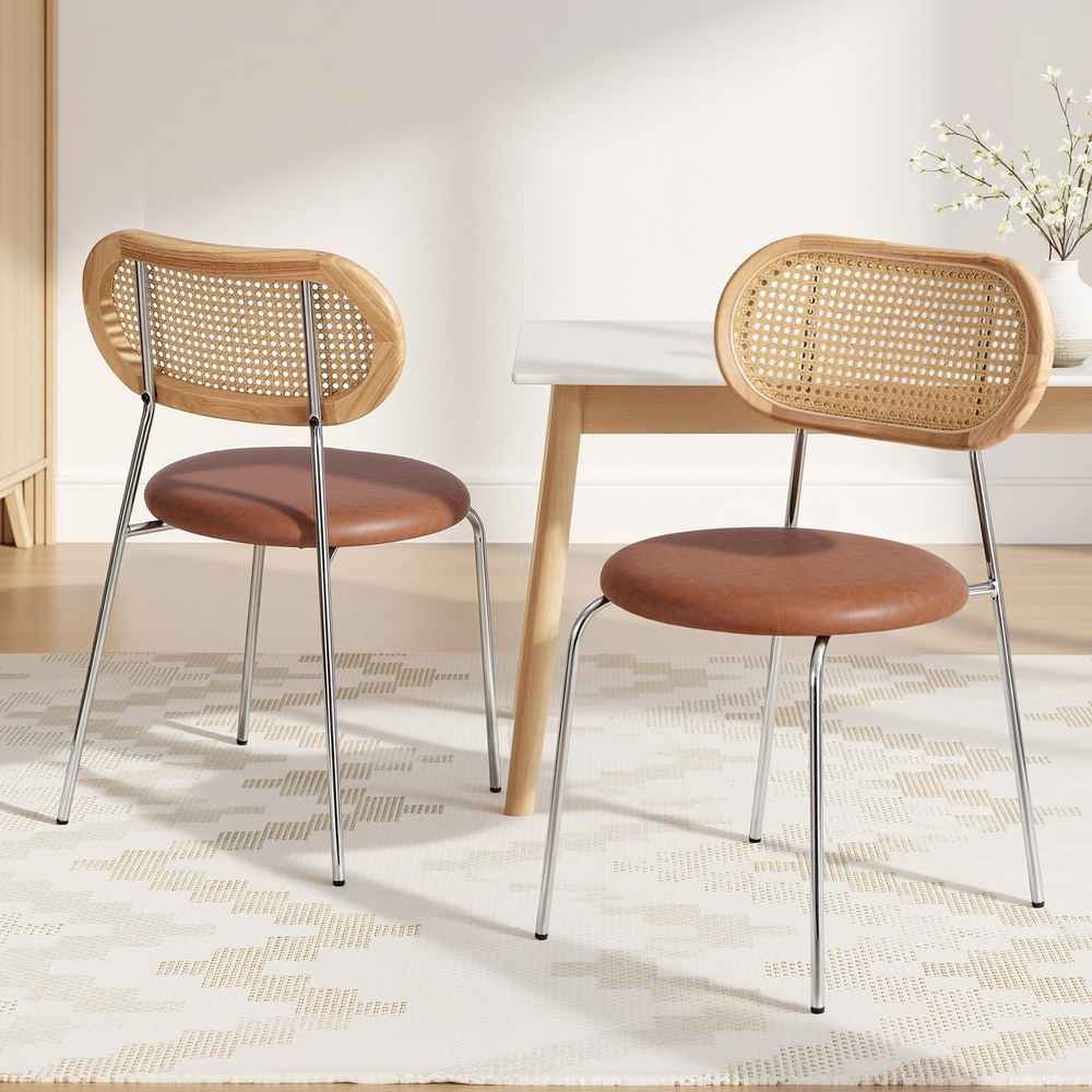 Add warmth and character to your dining space with this elegant set of two retro dining chairs. Blending natural texture with modern durability, each chair features a breathable rattan-style backrest paired with a rich brown PU leather seat. The rounded seat shape and ergonomic back support make them a comfortable choice for long dinners, weekend brunches, or relaxed catch-ups with friends.