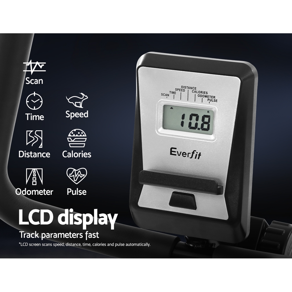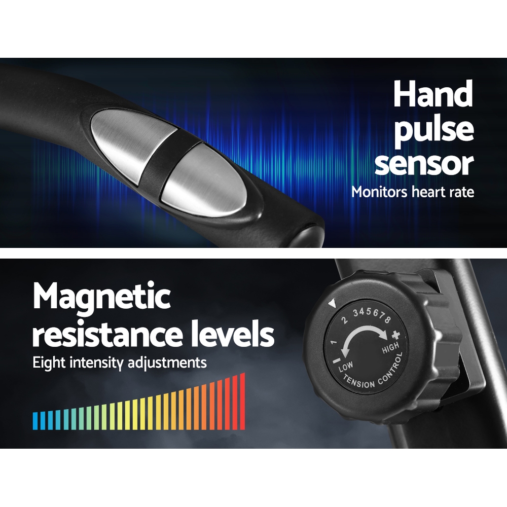 Get an effective workout in the comfort of your home while watching TV or listening to your favourite music. Our Recumbent Exercise Bike is just perfect to have all these at once. Designed for people who prefer a low or non-impact exercise regimen, our recumbent bike provides adequate exercise for the body without causing undue stress and strains on your joints and back. The relaxed seating position actually allows you to balance your body weight better and get your legs and heart to work together in tandem for better blood flow. The LCD display also helps to track parameters easily to let you monitor your health while exercising. The bike itself is constructed of an industrial-strength power-coated steel frame for durability and rust resistance. With up to eight resistance levels, the bike can be adjusted for the desired exercising intensity to suit your workout. Plus, the magnetic flywheel is smooth and runs almost friction-free. Other features include an adjustable seat length, wide and comfortable seat and non-slip protective feet. Not least, the recumbent bike is also easy to transport with two handy wheels for hassle-free moving.