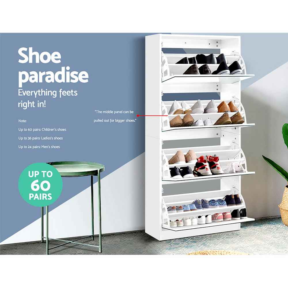 Featuring four pull-down compartments with three adjustable shelves per compartment, this cabinet accommodates shoes of all shapes and sizes—from boots and heels to flats and sneakers. With a total capacity for up to 60 pairs of shoes, it is perfect for children, women and men alike.