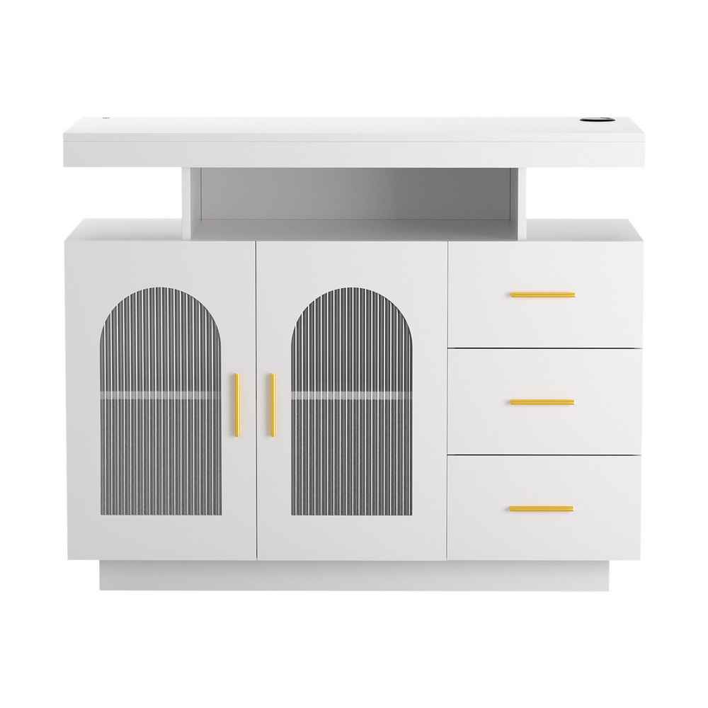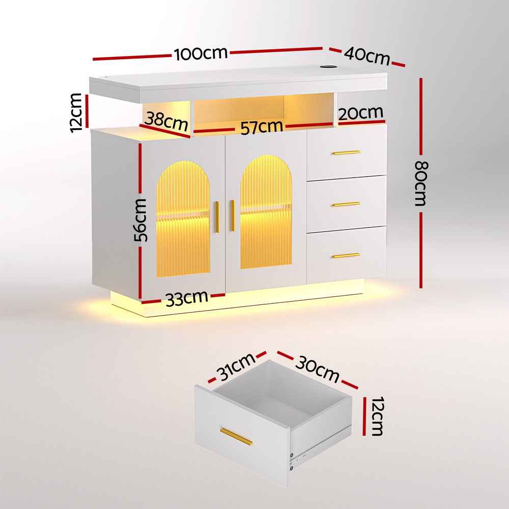 The built-in adjustable LED lighting creates a warm and inviting atmosphere, while the convenient 3-in-1 charging port (wireless, USB, Type-C) keeps your devices powered up with ease. Designed with a sleek matt finish, transparent arched acrylic doors, and gold metal handles, this buffet adds a sophisticated touch to your home décor.