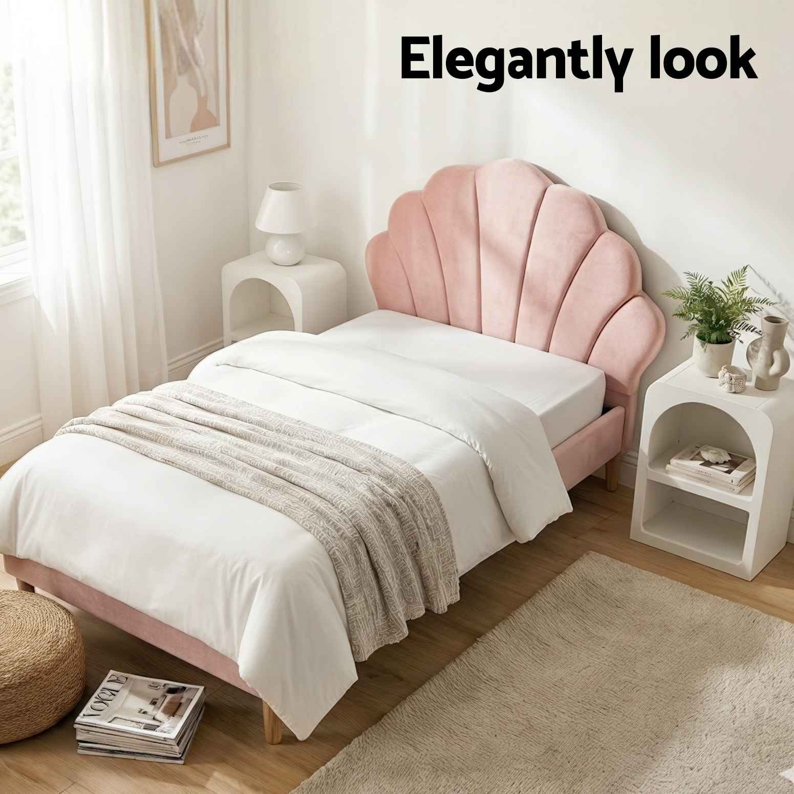 The scallop-shaped velvet headboard brings a soft, feminine charm to any bedroom, while the white bedside table adds a clean, timeless look.