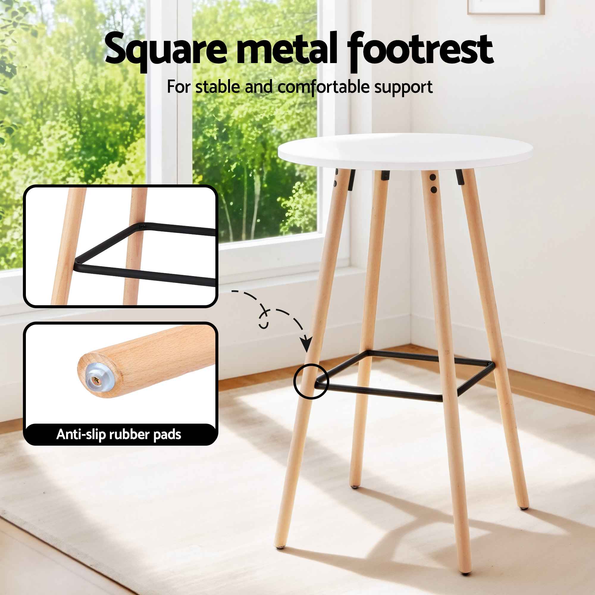 The square metal footrest makes seated time more comfortable, whether you’re enjoying breakfast or entertaining guests.