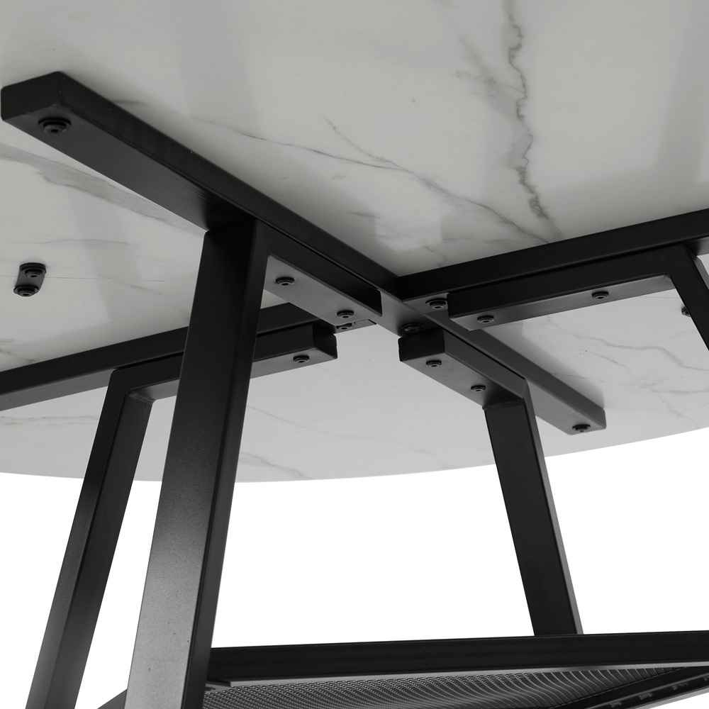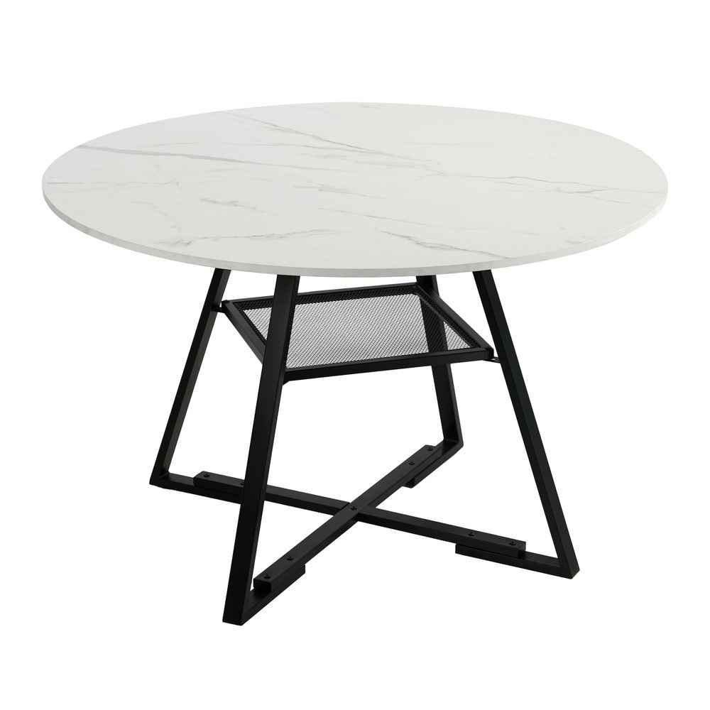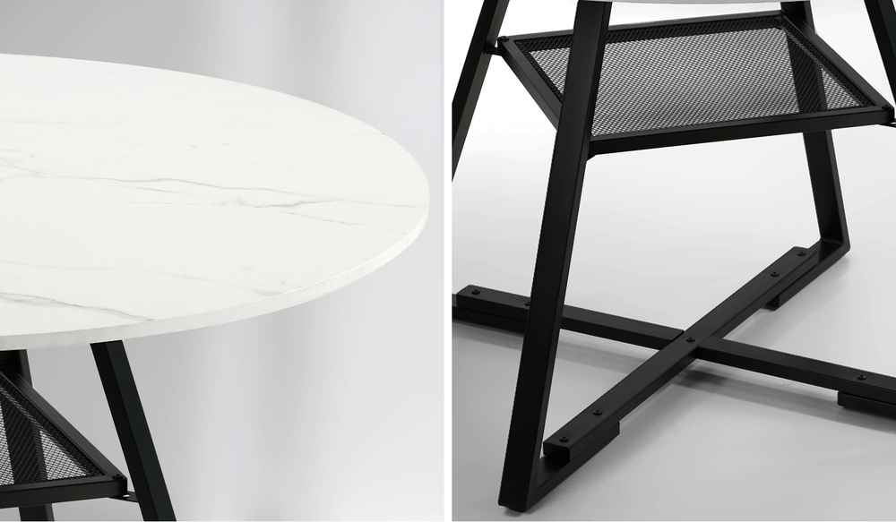 The smooth marble-look tabletop adds a refined touch, while the sturdy powder-coated steel frame provides reliable support for daily use. A built-in metal storage shelf underneath helps keep dining essentials close by and your tabletop clear, making it a smart choice for busy households.