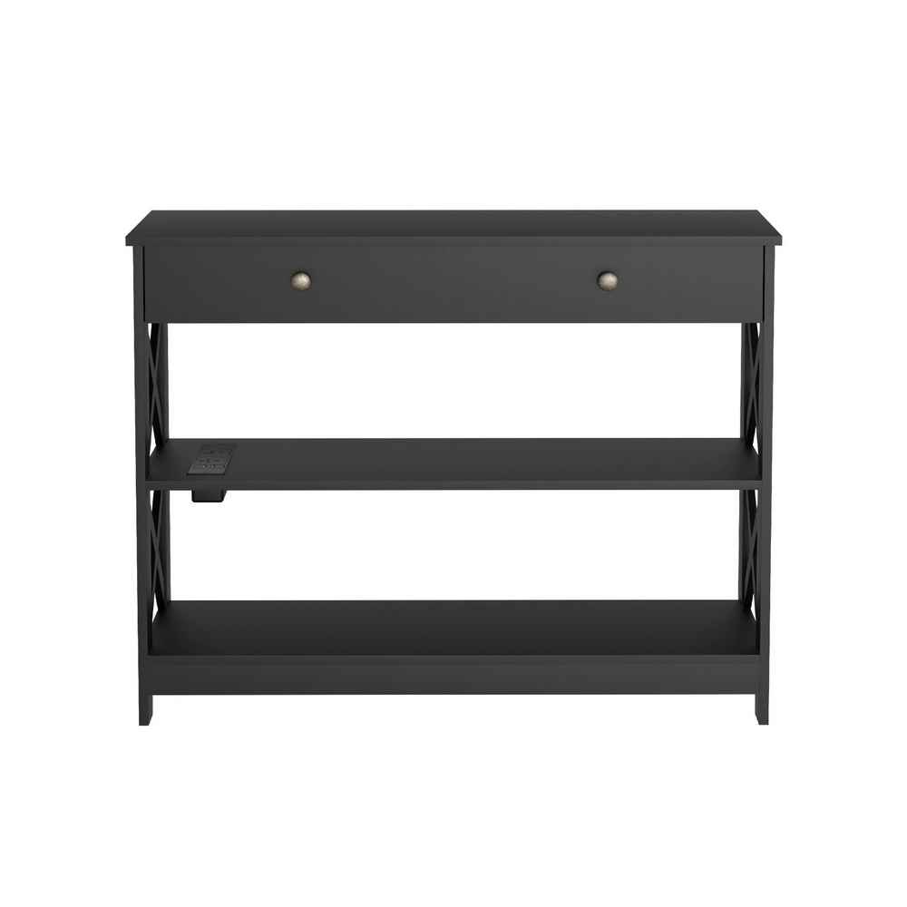 Enhance your home or office space with this stylish black console table, designed for both functionality and elegance. Perfect for entryways, living rooms, or workspaces, this table combines a contemporary X-shaped design with practical storage solutions and integrated charging ports.