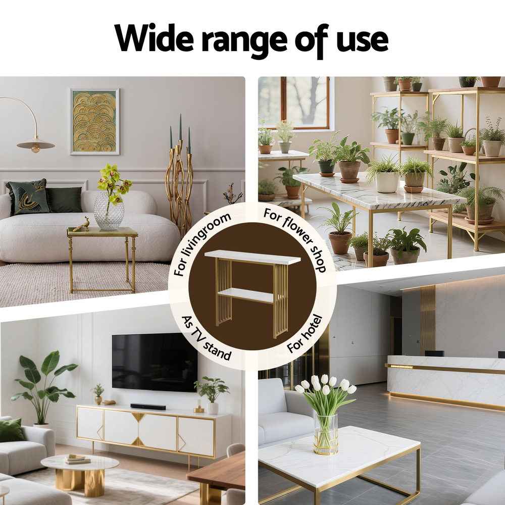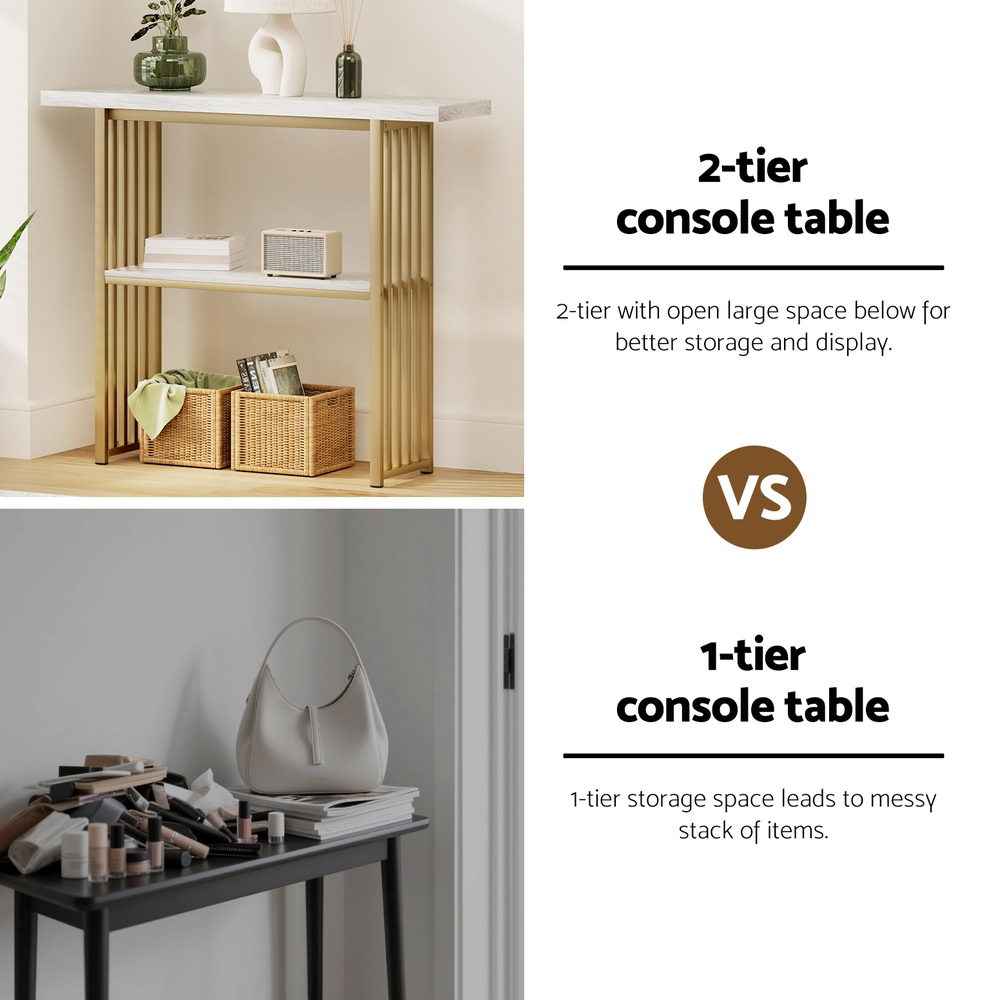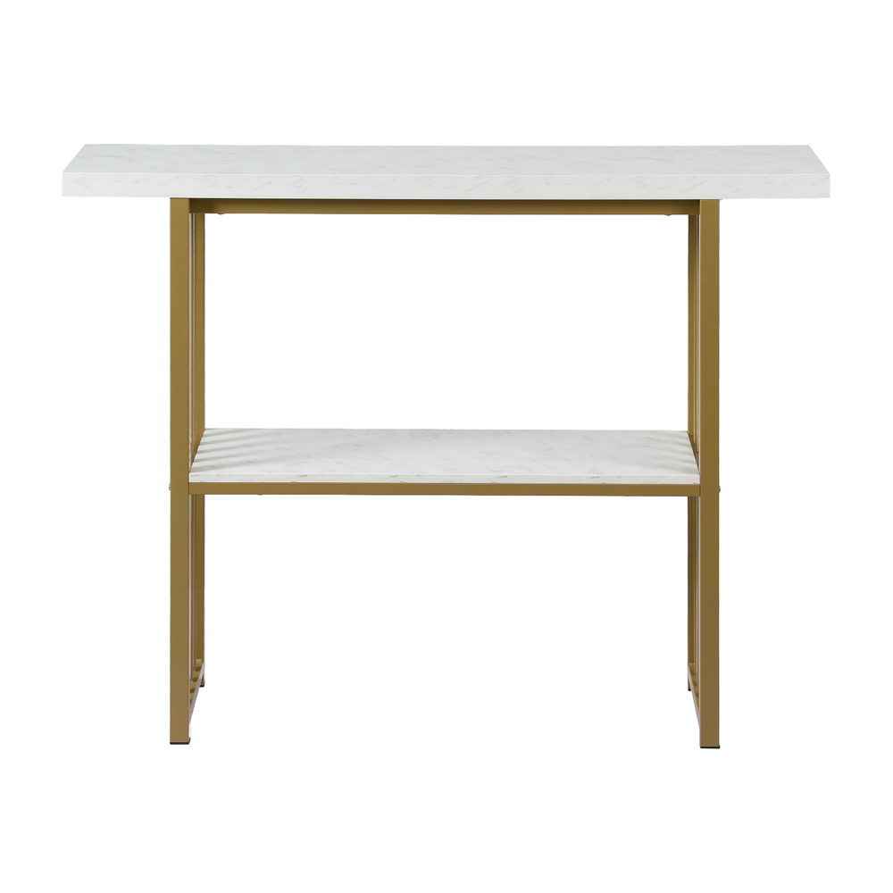Upgrade your hallway, living room, or office space with this stylish and functional console table. Combining practicality with contemporary design, this table features a thickened tabletop with a realistic faux marble finish and a sturdy gold powder-coated metal frame. Perfect for enhancing any interior, it offers both elegance and durability.