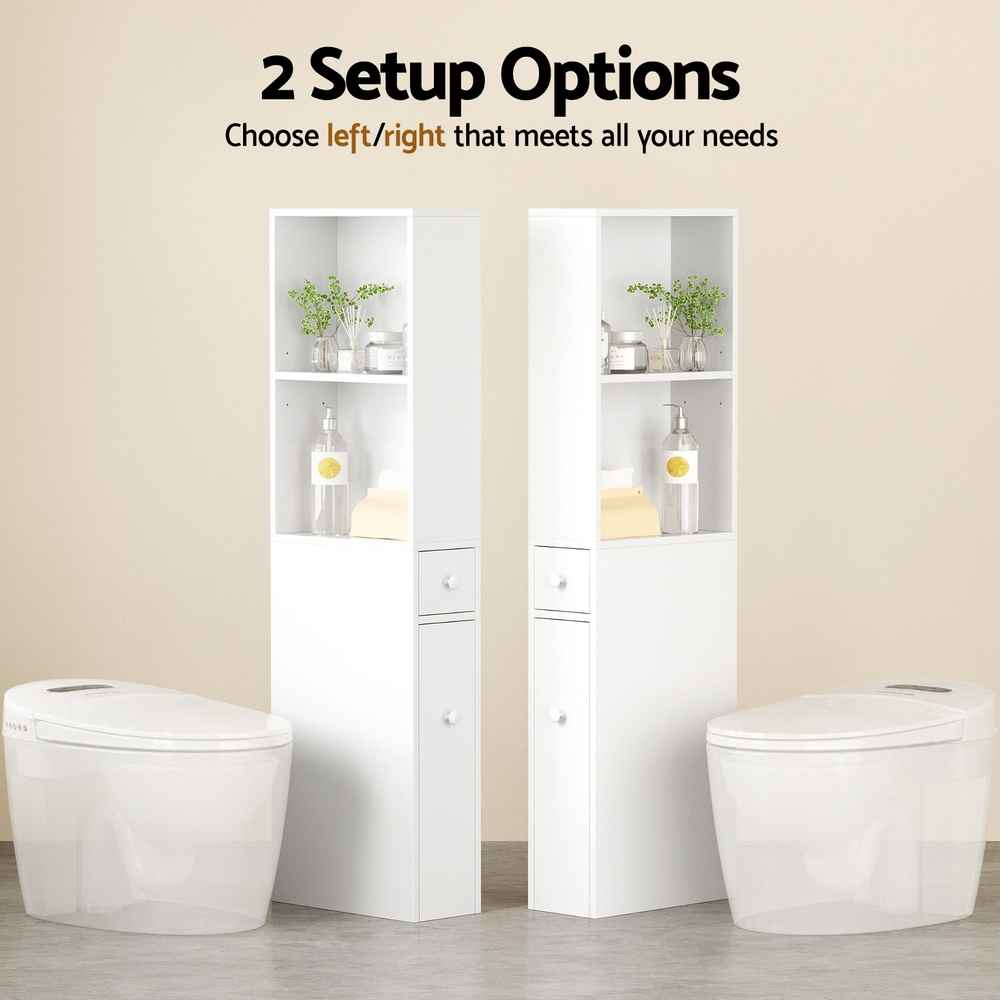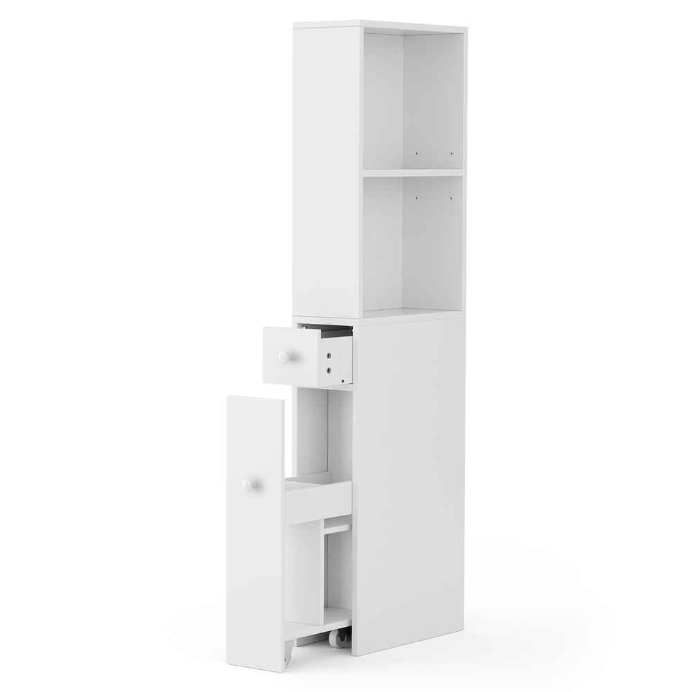 This cabinet’s slim, space-saving design makes it a perfect fit for tight corners while still providing ample storage. The adjustable open shelves let you customise your layout for towels, toiletries, or decorative items, while the slide-out drawer keeps smaller essentials neatly tucked away. The pull-out cabinet with 3 wheels ensures easy mobility and accessibility, giving you a flexible solution that adapts to your needs.