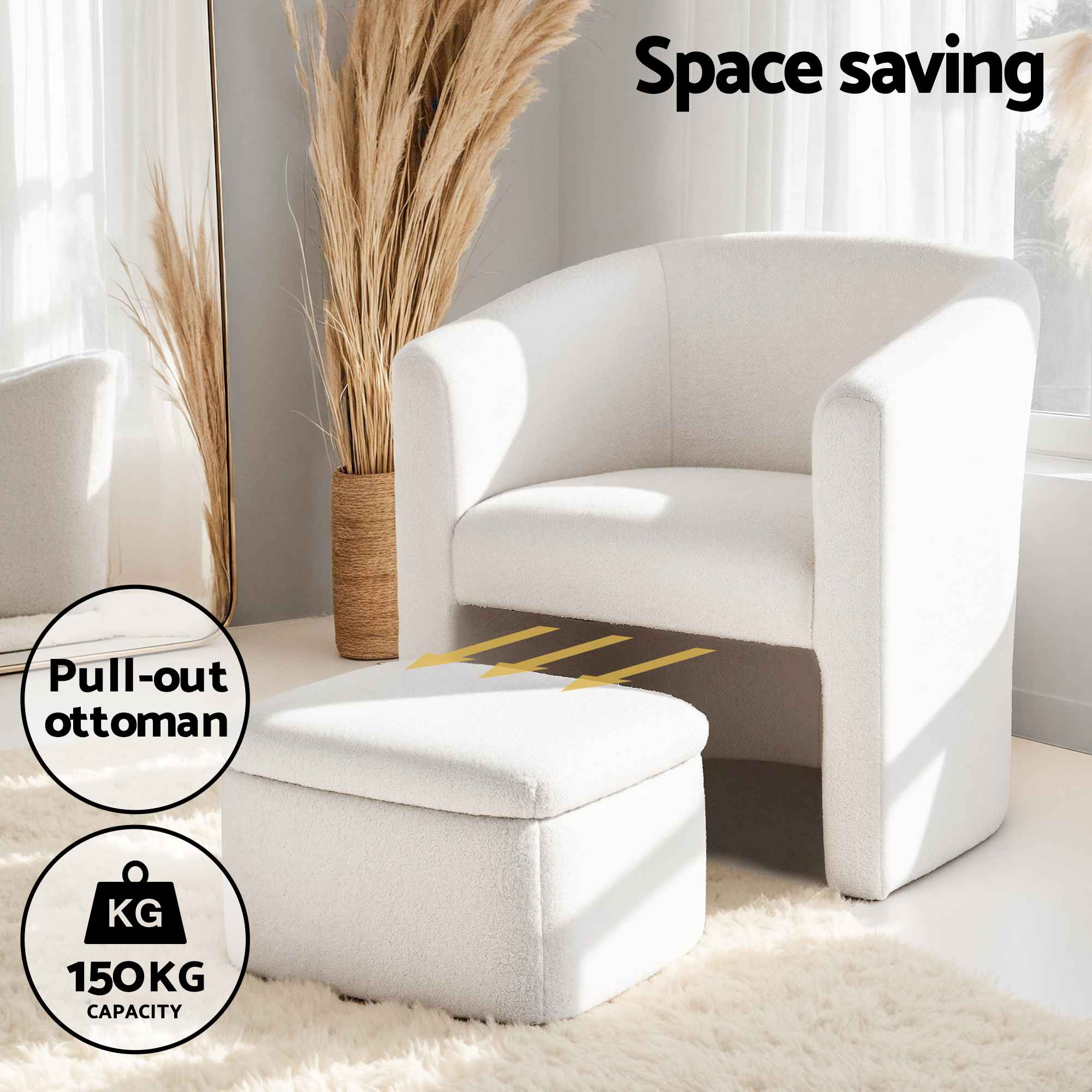 Create a warmer, more functional space with this white sherpa armchair and ottoman set. Designed for modern homes and cosy corners, it pairs soft sherpa fleece upholstery with supportive cushioning and a pull-out ottoman that doubles as hidden storage.