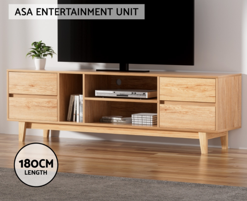 Style and functionality blend together in the beautiful Entertainment Unit. This lowline entertainment unit has the perfect height and storage capacity for all your entertainment needs, from your television to your sound system and consoles. The simple handle-less design and natural wood-grain finish will blend in perfectly with modern homes. Made from thick particleboard with a smooth melamine finish and solid rubberwood, the unit is sturdy and durable for long-lasting use. Four generous storage drawers and three open shelves with cable management are perfect for your media, books, equipment and other trinkets. The solid rubberwood legs feature anti-slip feet to ensure the unit stays standing and prevents scratches to your floors. Easy to assemble and even easier to maintain, the Asa Entertainment Unit will keep your home theatre organised for years to come.