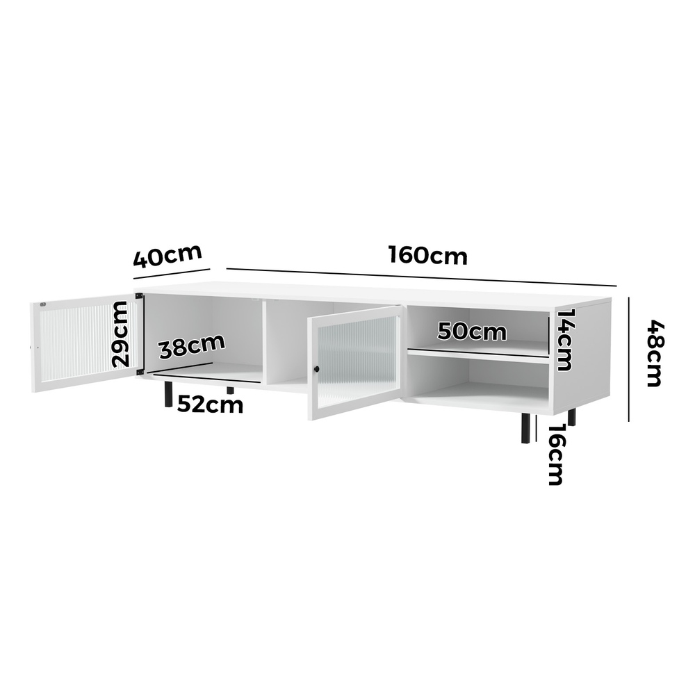 The closed interior spaces with large tempered-glass cabinet doors are cavernous with plenty of room for all your entertainment paraphernalia while the two open shelves add complementary storage with equally spacious offerings.